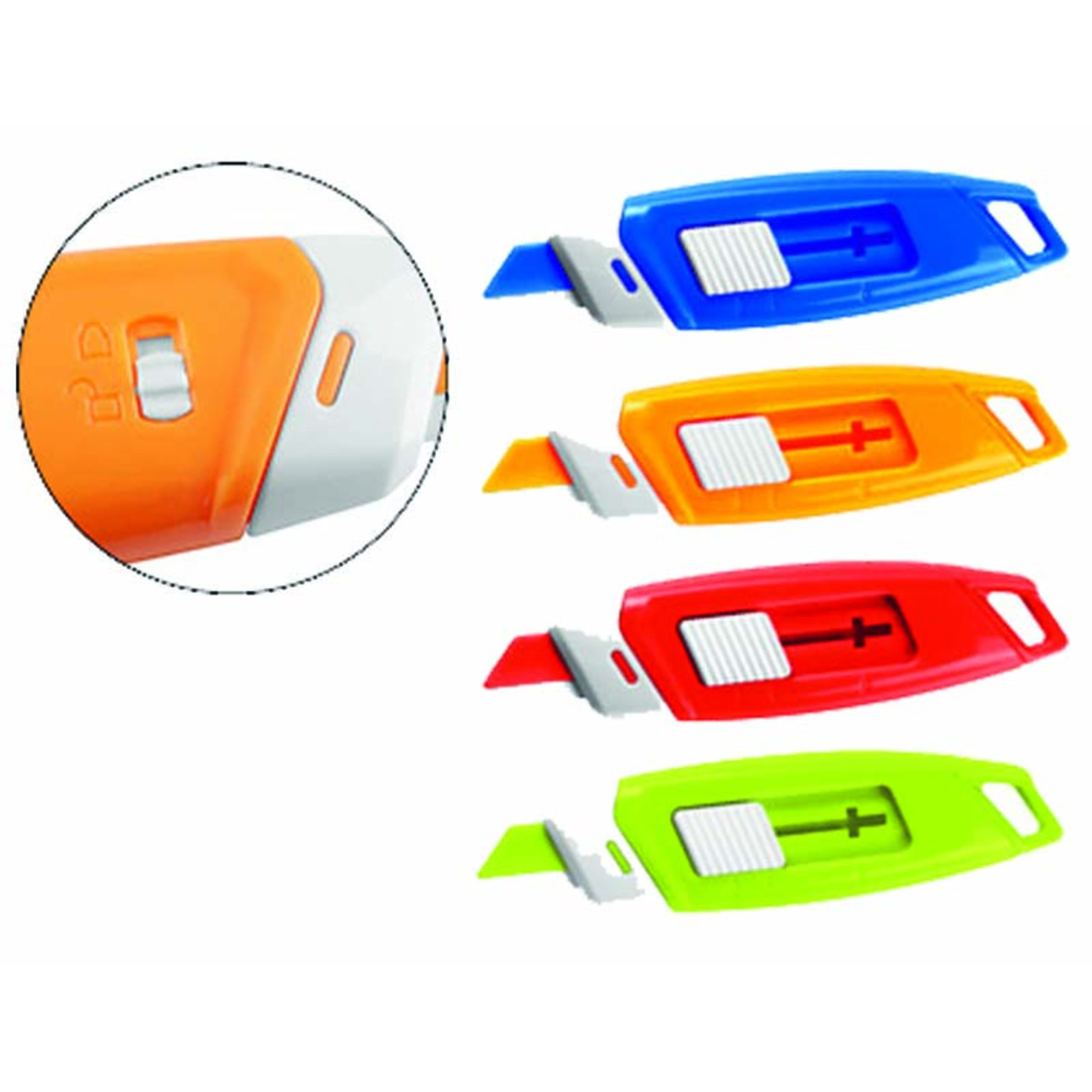 Mini cutter avec lame en céramique. Verrou de sécurité pour éviter les coupures. Encoche fenêtre pour insérer un cordon. Largeur de la lame : 7 mm. Longueur : 33 mm. Coloris aléatoire : bleu ou rouge.Dim. (L x l x H) : 16 x 27 x 92 mm - Le cutter
