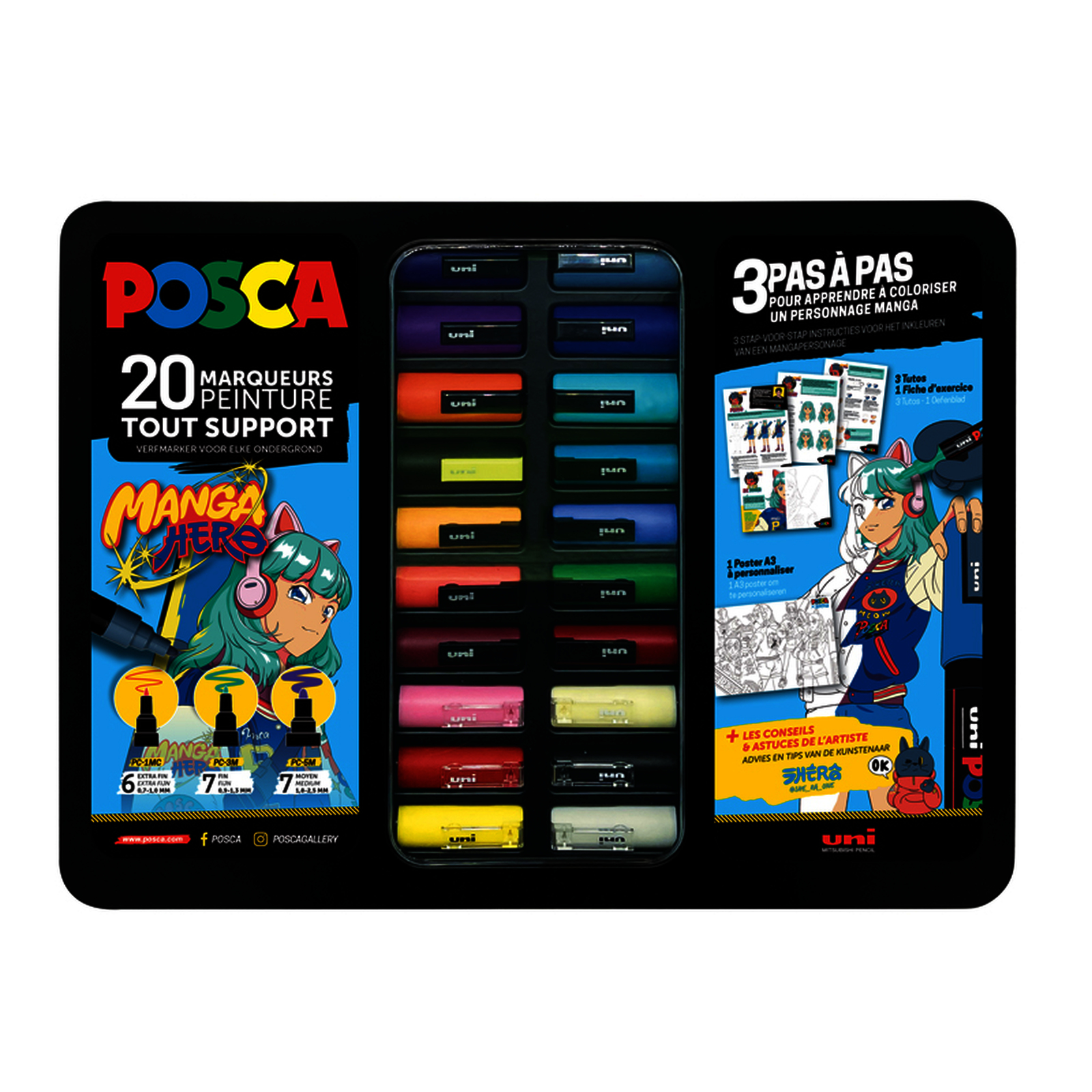 Mallette en m?tal Posca Manga. Livr?e avec 3 tutos, 1 fiche d'exercice + 1 poster A3 ? personnaliser.