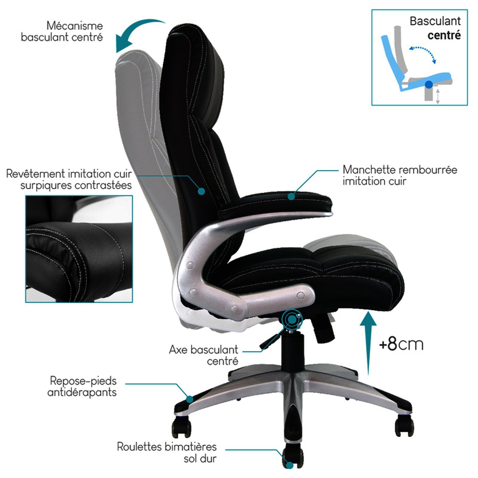 Régulation de la hauteur par pneumatique. Mécanisme désynchronisé : le dossier et le siège s'adaptent indépendamment aux mouvements de la personne assise. 5 roues en nylon Ø 6 cm. En imitation cuir noir et maille. Base solide et robuste en acier chromé. Accoudoirs fixes en polypropylène. Convient, pour une hauteur d'assise optimale, aux personnes mesurant de 185 cm à 205 cm. Poids maximum supporté : 130 kg. Usage régulier : de 5 à 8 heures par jour. Dimensions : 1110 + 100 x 610 x 640 mm. Poids : 12,6 kg.
