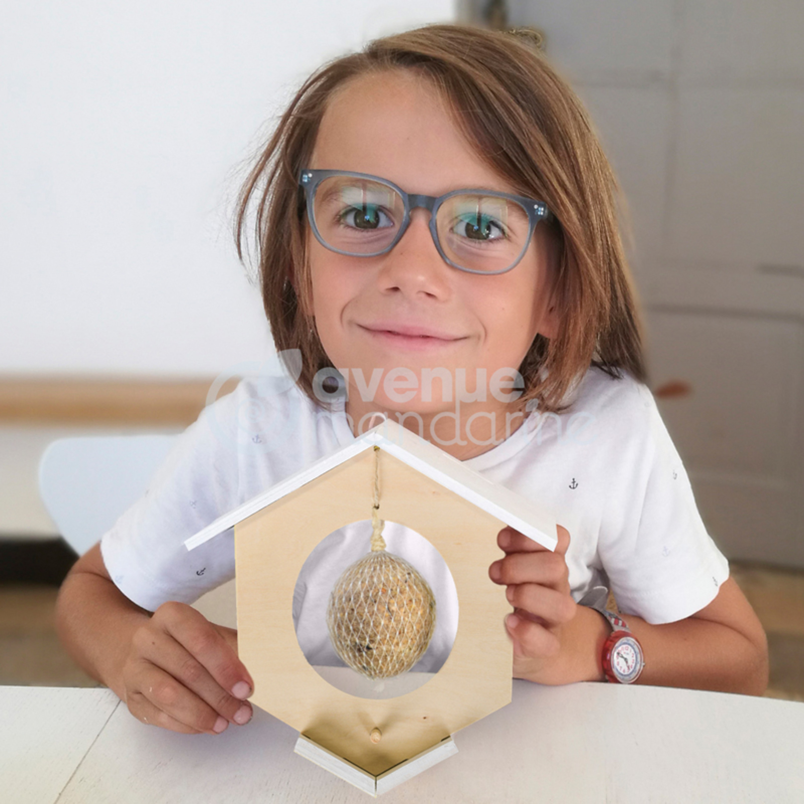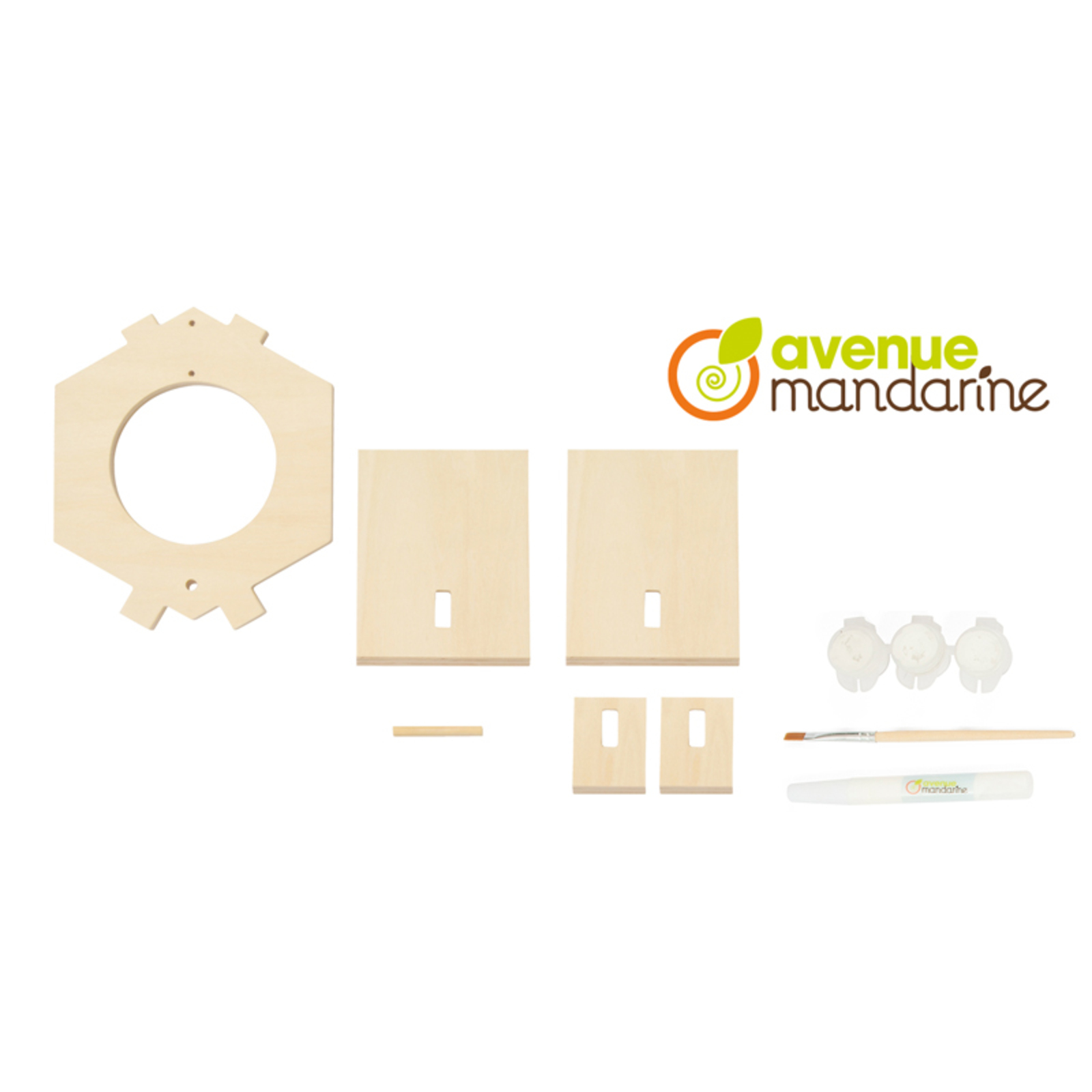 Contenu : pièces de construction en bois - Peinture acrylique blanche - 1 pinceau - Colle - Notice