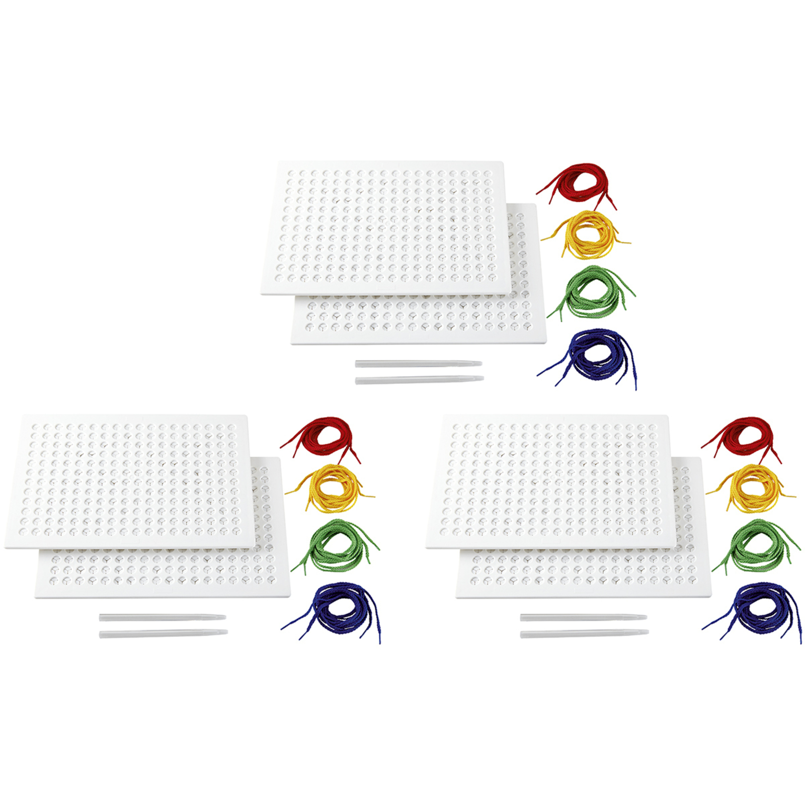 En créant des lignes ou une trajectoire avec le lacet et le crayon, Picfil permet aux enfants de stimuler la précision gestuelle et la coordination des mouvements, d'exercer le sens de l'observation et de mettre en œuvre la capacité créative.Chaque enfant pique le bout de son crayon dans le trou sans tirer sur le lacet, quand il relève son crayon, le lacet reste dans le trou. Pour effacer, il suffit de tirer sur le lacet. L'ensemble comprend : 6 tablettes en plastique souple, 6 crayons guide-fil en plastique transparent, 24 lacets (rouge, jaune vert et bleu).L/l/ép. tablette : 27,5 x 19,5 x 1,2 cm.L crayon guide-fil : 13,5 cm.L lacet : 95 cm.