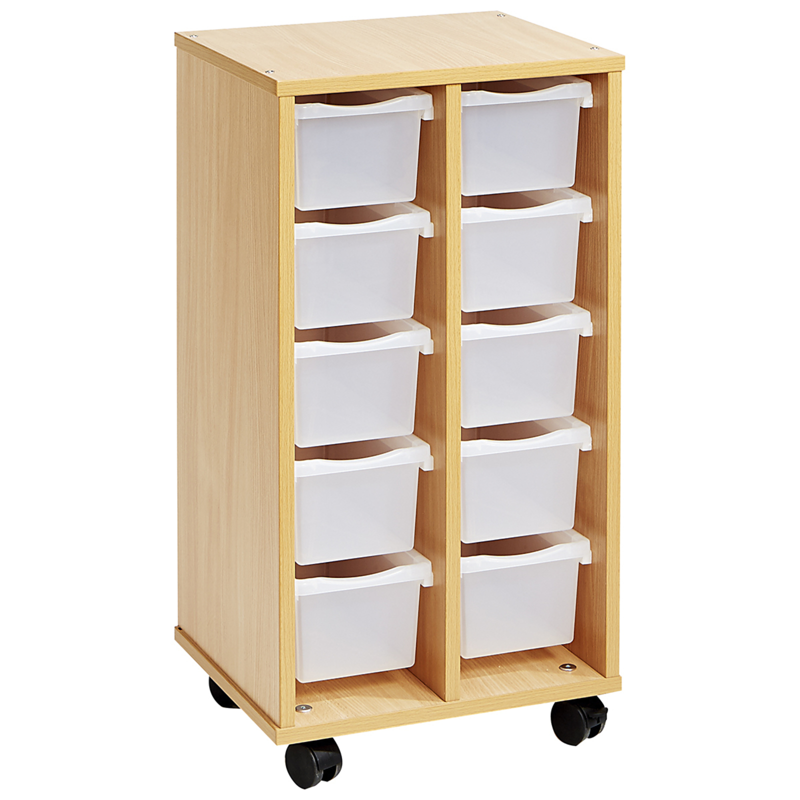 La colonne basse, avec 10 petits bacs incolores, complète idéalement les autres meubles de la gamme pour :optimiser le rangement, organiser les activités, favoriser l’autonomie des enfants.Identification rapide des petits bacs avec les porte-étiquettes clipsables (vendus séparément). Livrée avec 10 petits bacs incolores et avec roulettes, dont 2 à freins.Livrée à plat avec 1 notice de montage.L/l/H : 34,6 x 41 x 77 cm.En mélaminé teinte hêtre.
