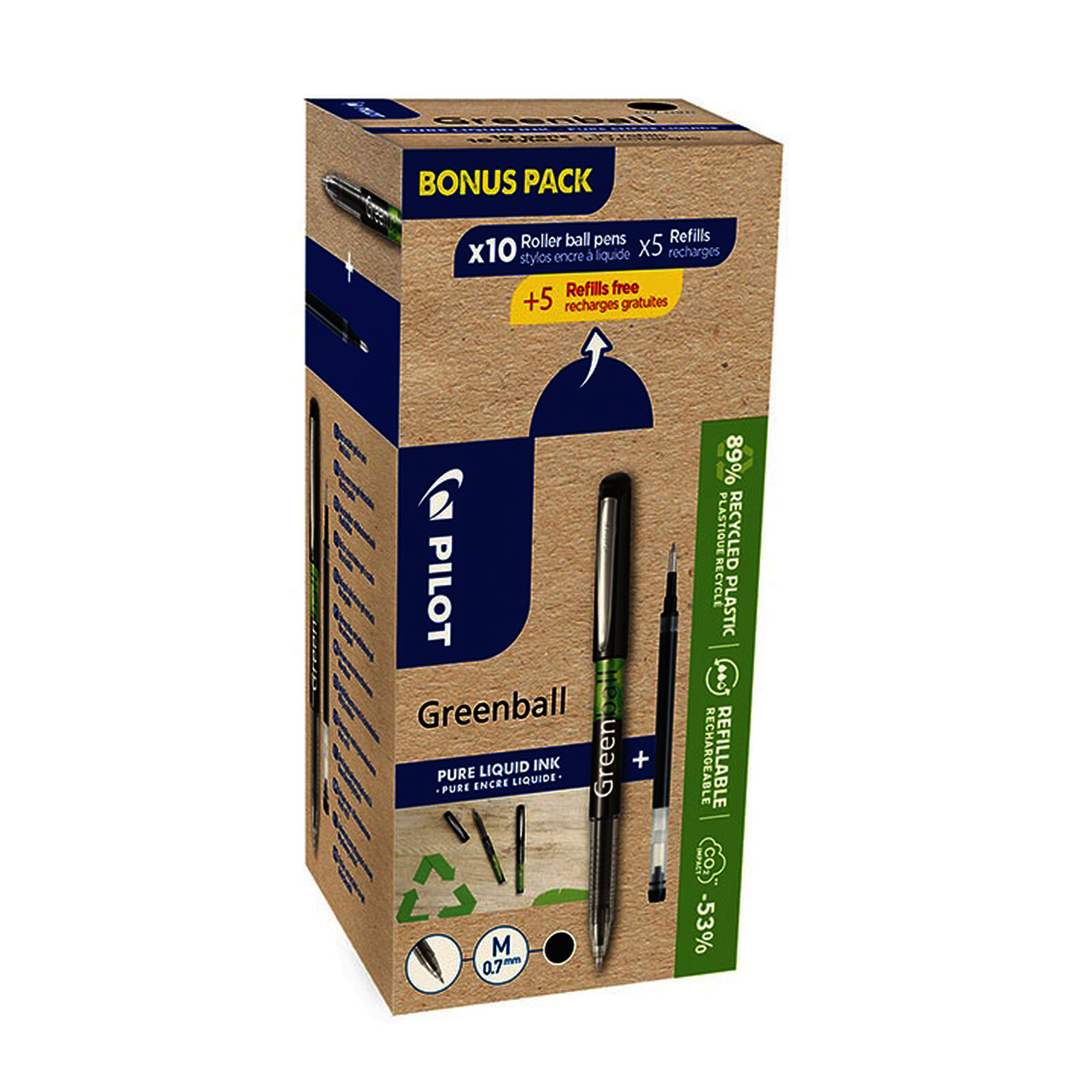 10 STYLOS + 10 RECH. GREENBALL NOIR PTE MOY. 0,7 MM PILOT