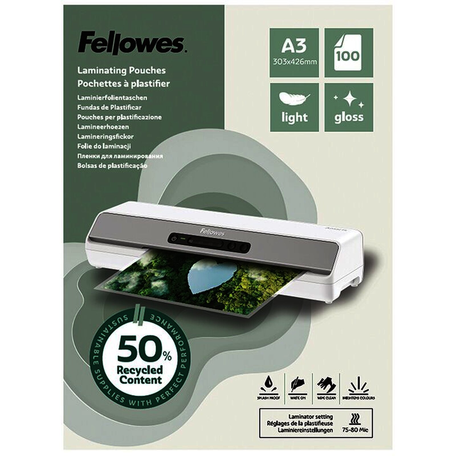 BTE 100 POCH. PLASTIF. BRILLANTES RECYCLÉES FELLOWES A3 80µ