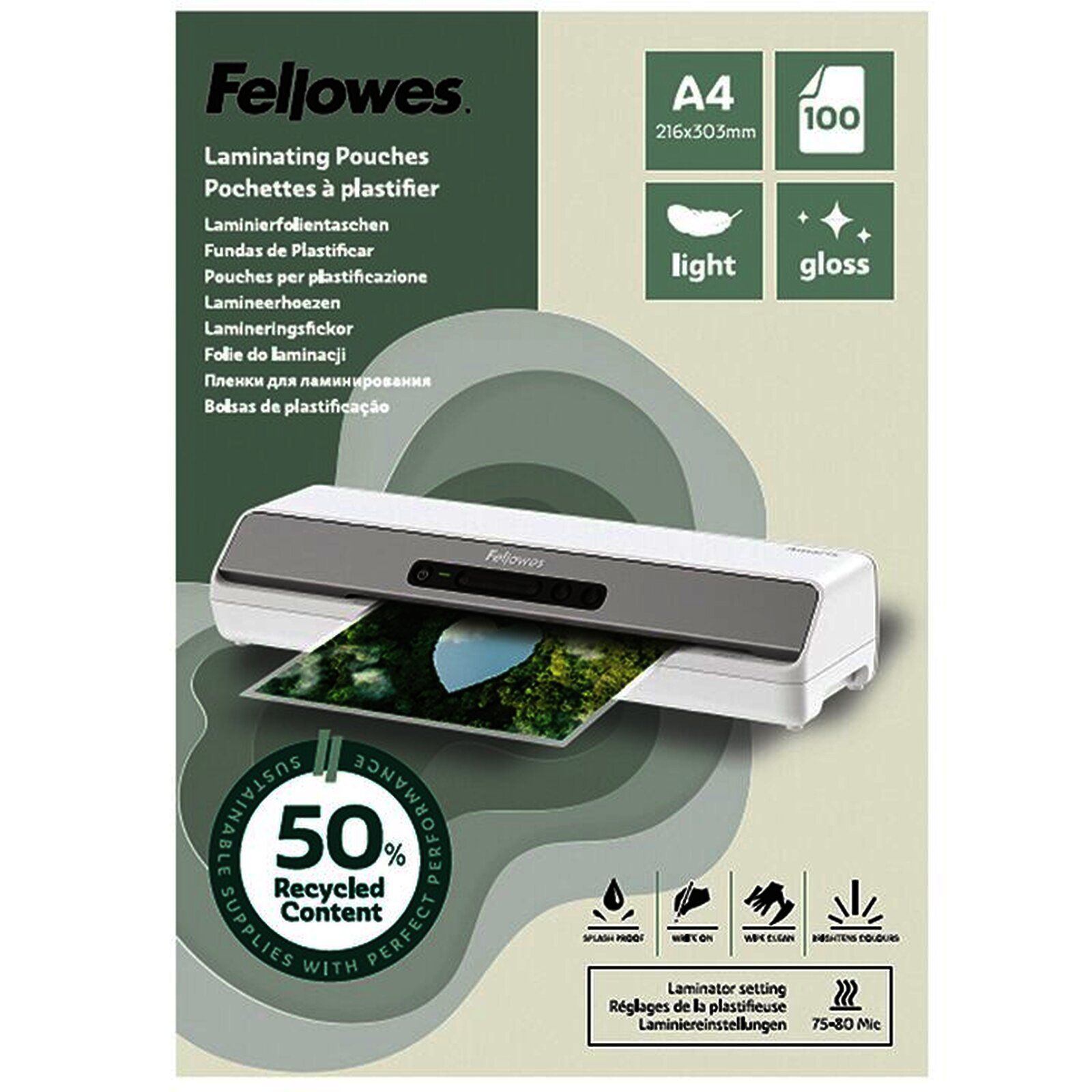 BTE 100 POCH. PLASTIF. BRILLANTES RECYCLÉES FELLOWES A4 80µ