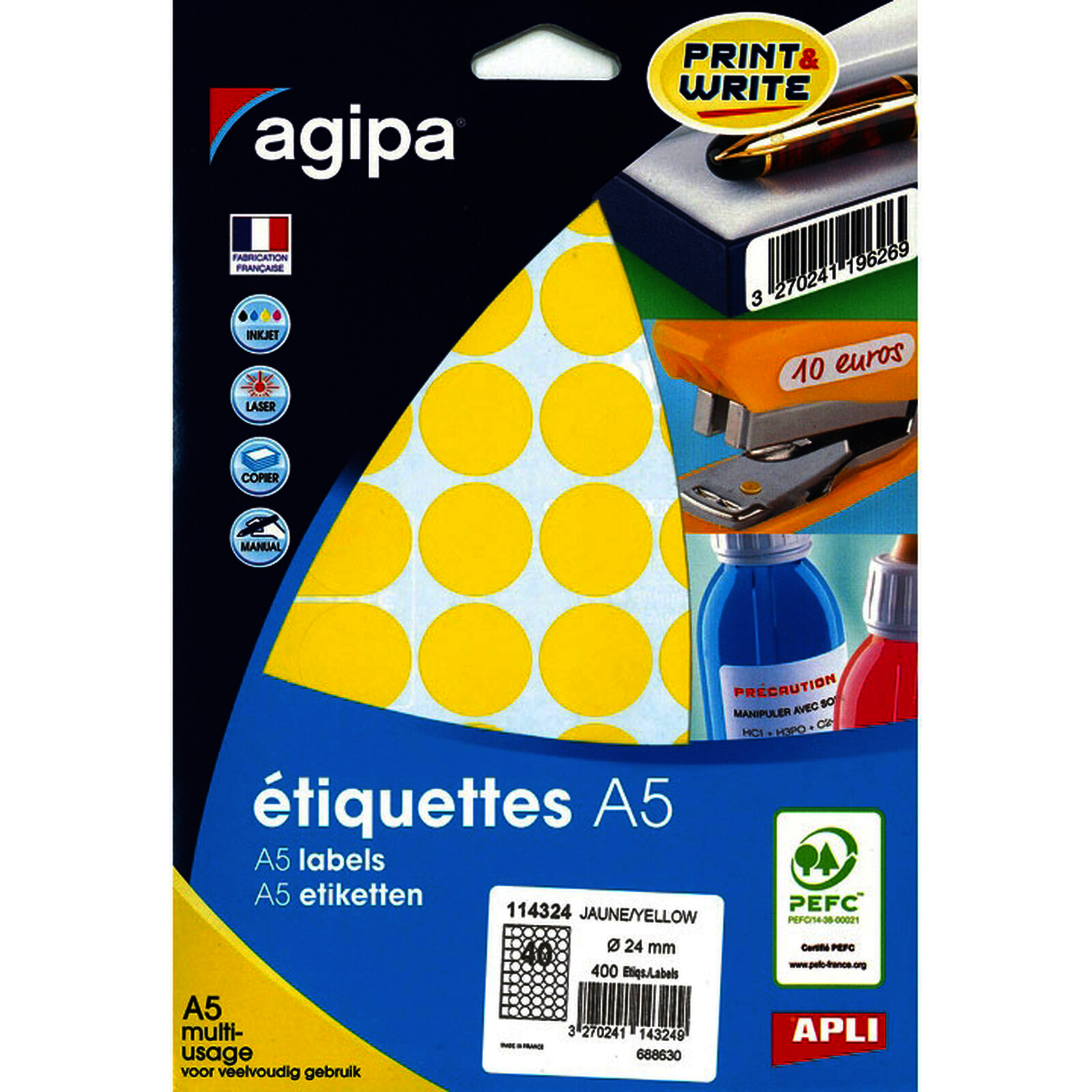 POCH DE 10 PLANCHES - 400 PASTILLES ADH JAUNE D24MM APLI