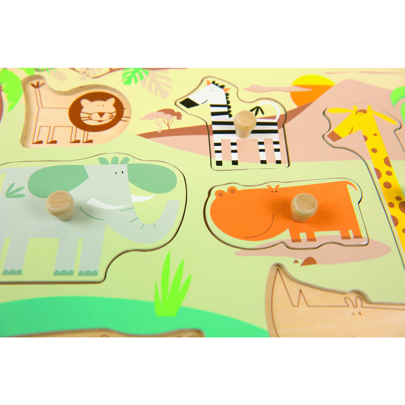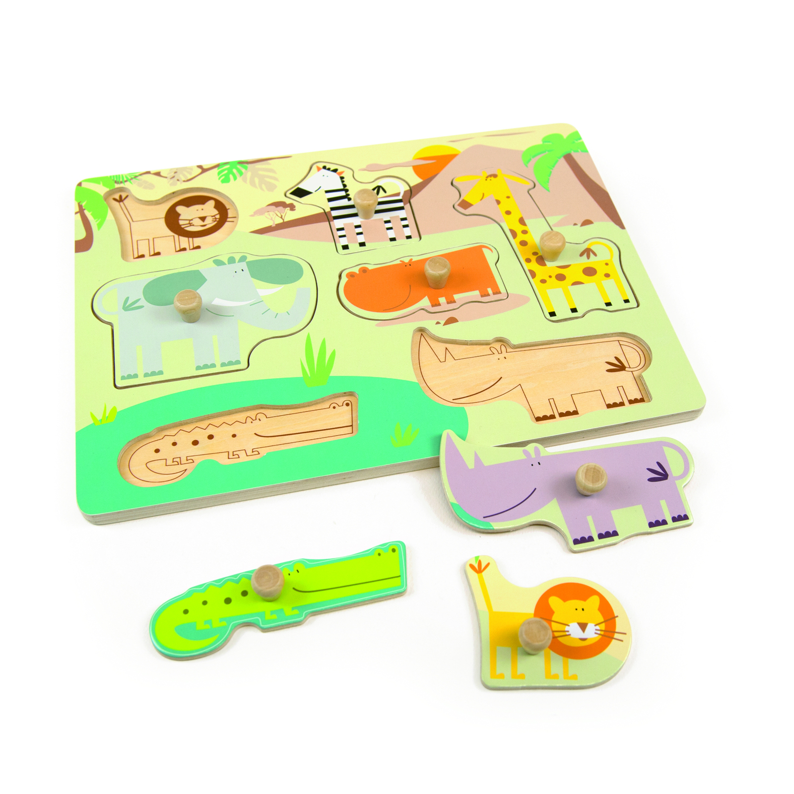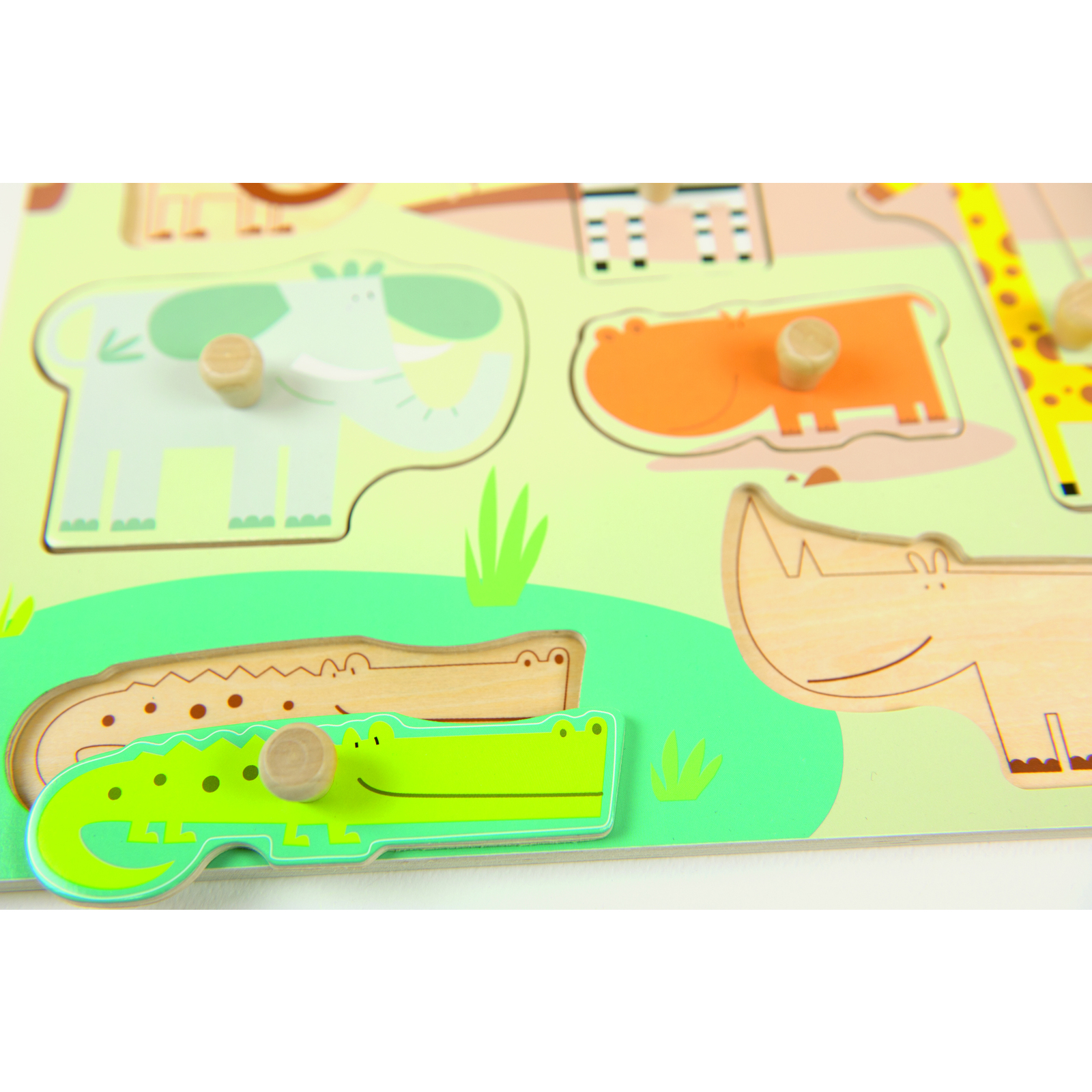 Encastrements à boutons sur le thème des animaux de la jungle. Les silhouettes des bêtes sont dessinées sur le fond du support. Contenu : 7 pièces et 1 support en bois Dim du puzzle (L x l) : 30 x 22,5 cm
