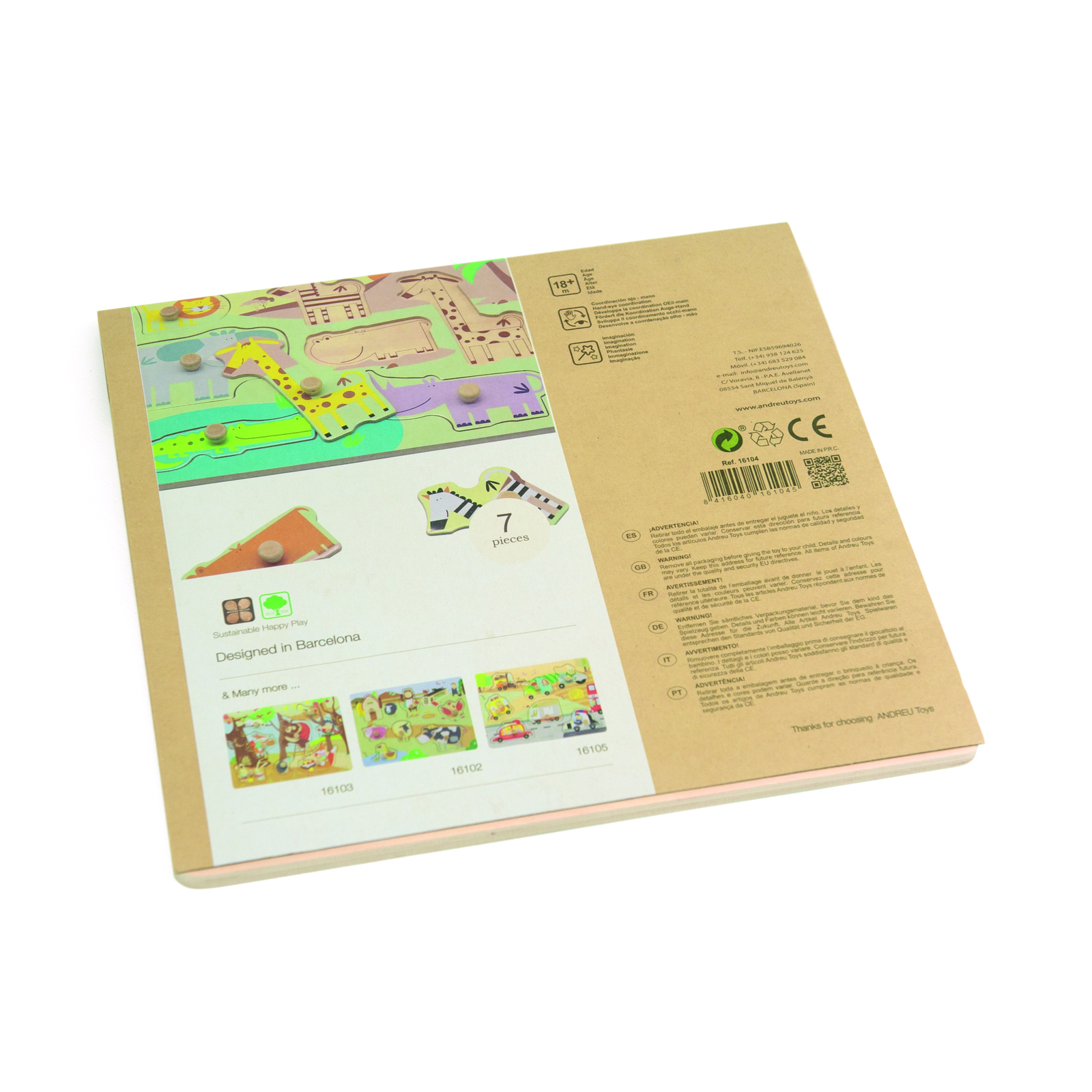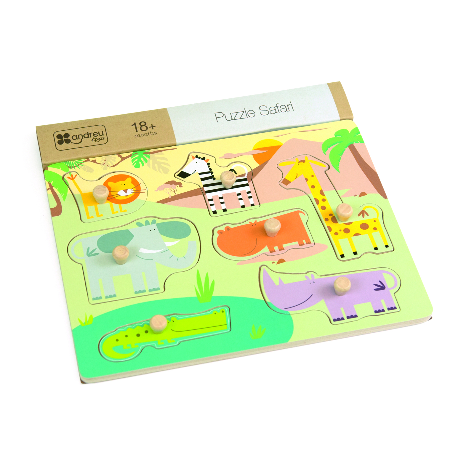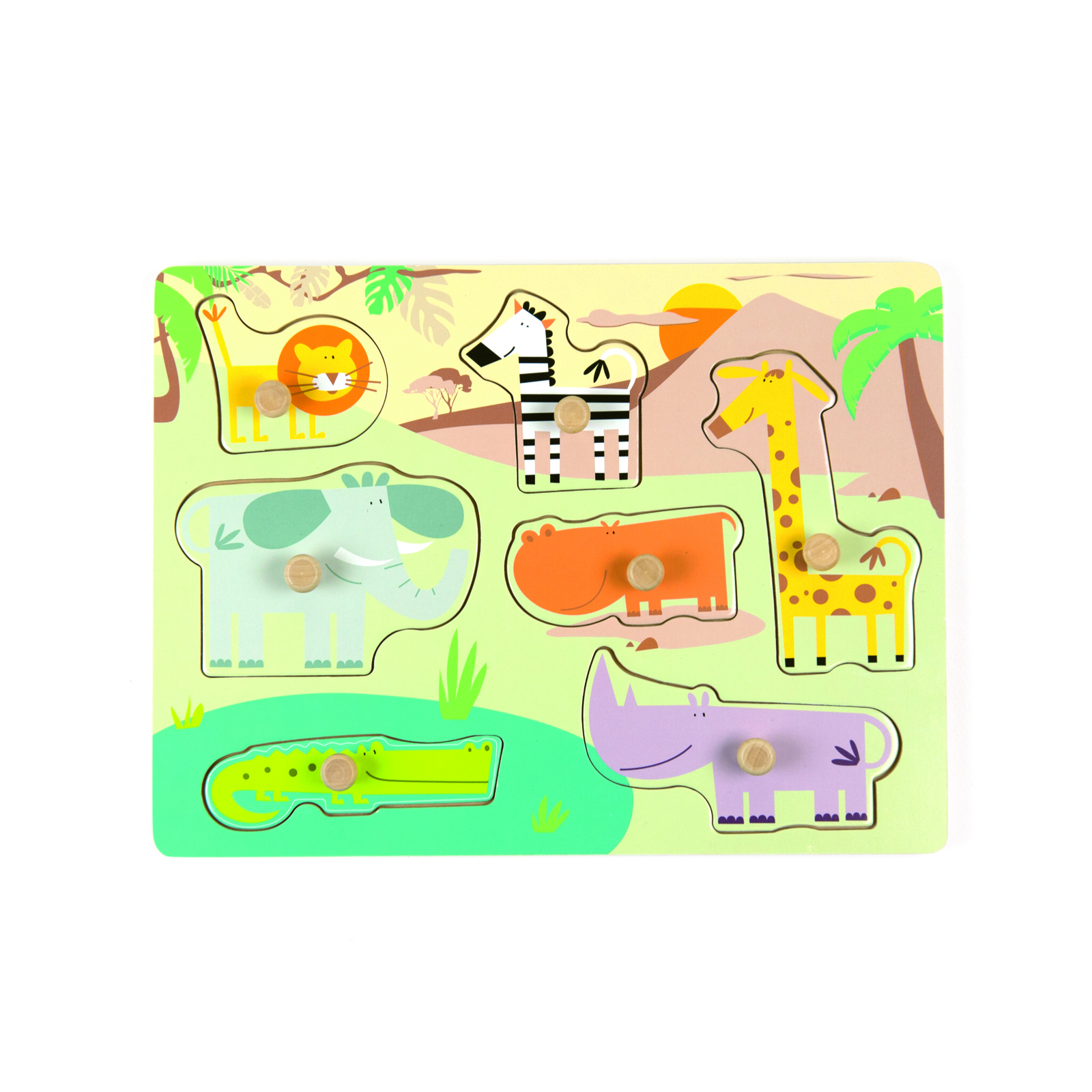 Encastrements à boutons sur le thème des animaux de la jungle. Les silhouettes des bêtes sont dessinées sur le fond du support. Contenu : 7 pièces et 1 support en bois Dim du puzzle (L x l) : 30 x 22,5 cm