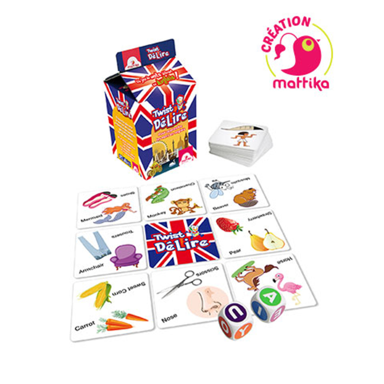 But du jeu : trouver, sur les cartes posées, les mots contenant les deux voyelles tirées par les dés. De nombreuses cartes avec un choix de vocabulaire soigné et des mots développant le lexique et l’orthographe en anglais.Contenu : 68 cartes picto, 1 carte Twist Délire, 3 cartes joker, 2 dés voyelles, 1 règle du jeu et 1 sac en toile2 à 6 joueurs - Durée : 15 min