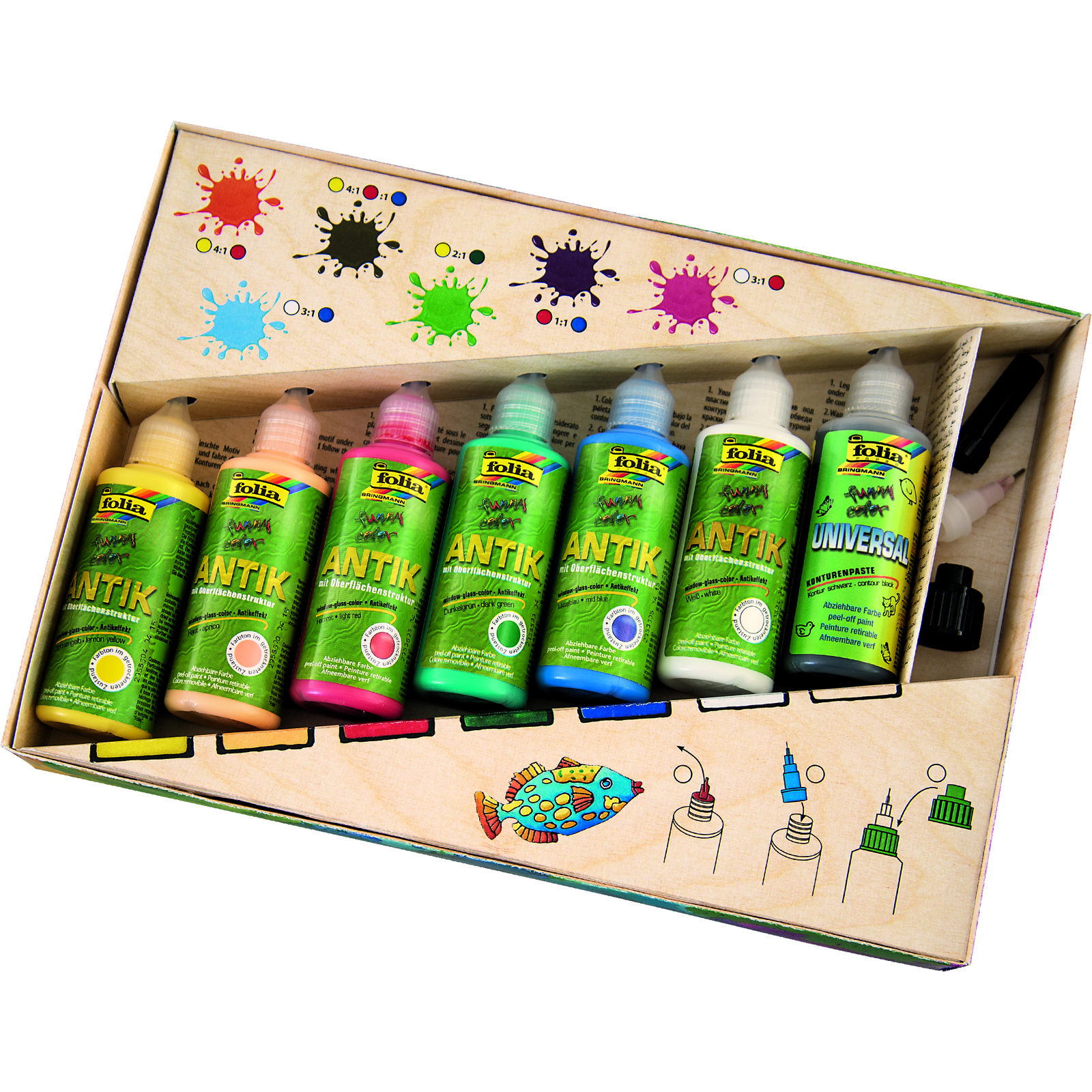 Contenu : 20 modèles à reproduire, 7 flacons de 80 ml de peinture coloris assortis et 1 plateau transparent