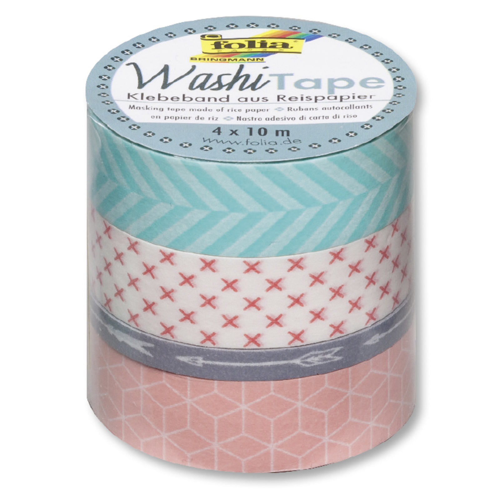 Assortiment de 4 rubans adhésifs : 3 rouleaux de 15 mm x 10 m et 1 rouleau de 5 mm x 10 m. Motif géometrie