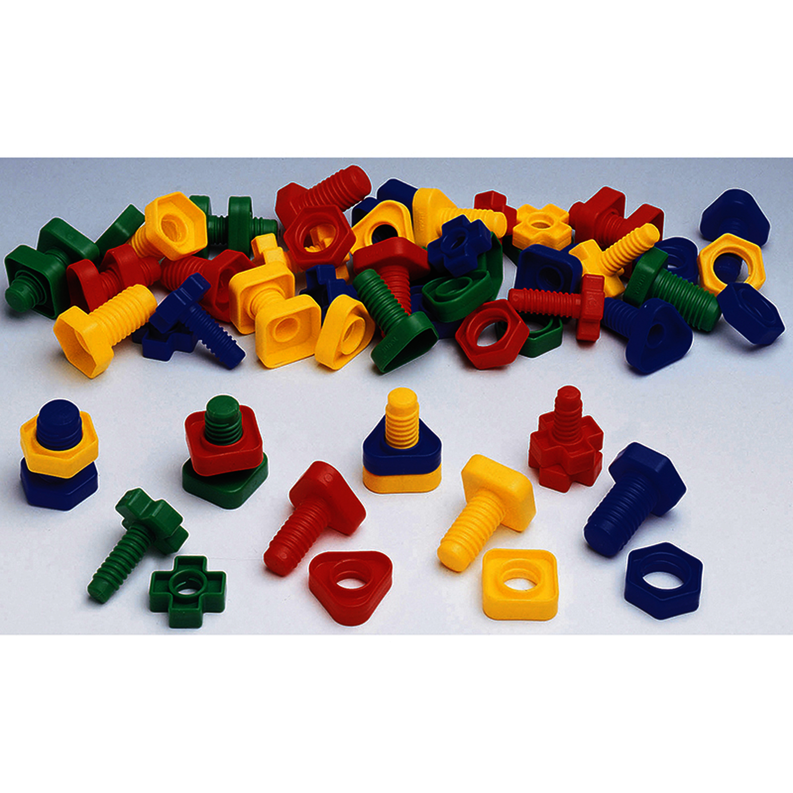 64 pièces (32 écrous et 32 vis) de grande taille en plastique rigide. 4 formes, 4 couleurs et 4 diamètres différents.64 pièces (32 écrous et 32 vis) de grande taille en plastique rigide. 4 formes, 4 couleurs et 4 diamètres différents.• Ø vis : 1,7 à 2,7 cm.