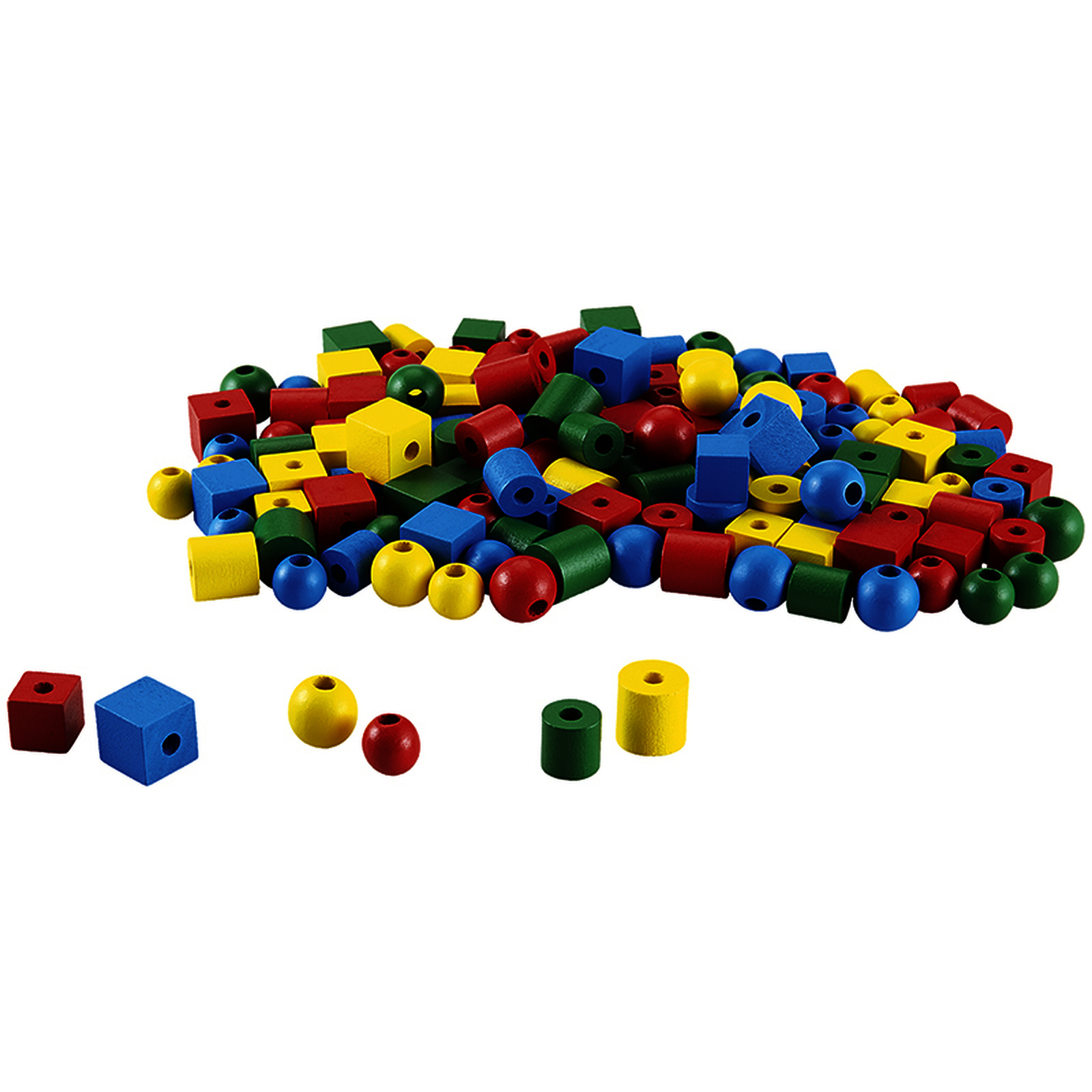 144 perles en bois avec 3 formes, 2 tailles et 4 couleurs.Assortiments de perles pour des exercices de tri ou d'enfilage :