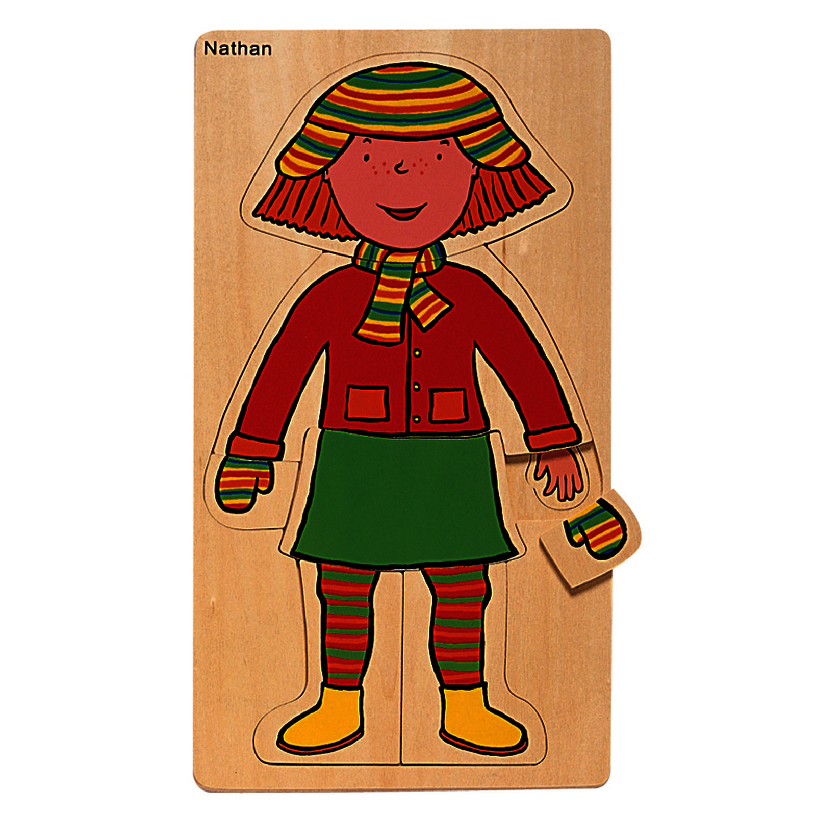 • Au-dessous, les différentes parties du corps ; au-dessus, les vêtements.• 1 Puzzle-encastrement à 2 étages composé de 22 pièces.