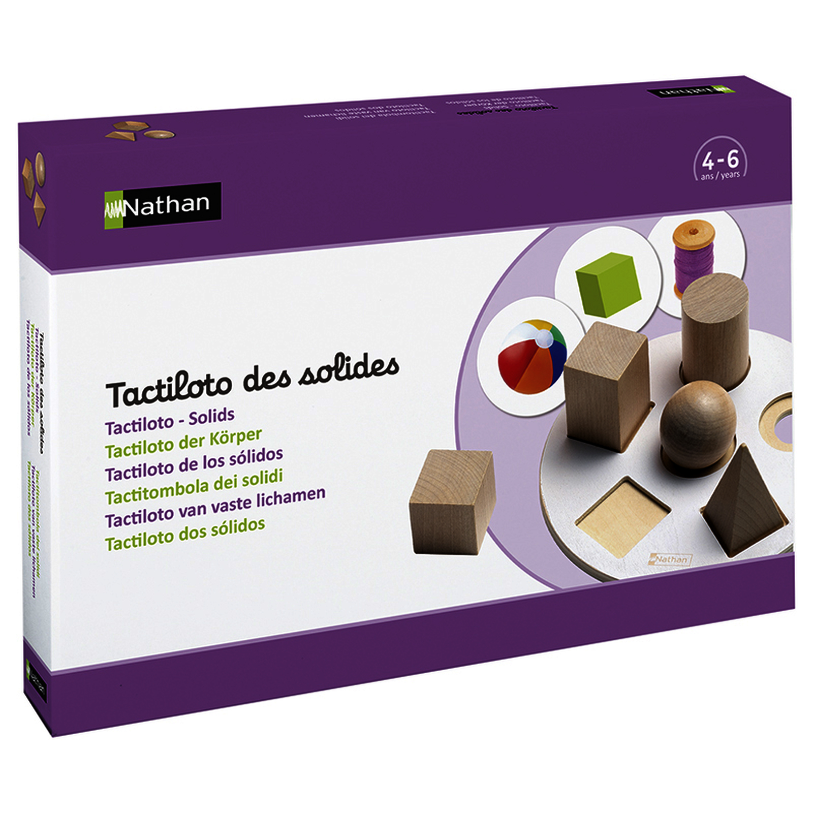 Tactiloto des solides est un matériel de manipulation évolutif, conçu pour jouer autour des premiers volumes géométriques.Par des approches complémentaires tactiles, visuelles et langagières, les enfants s’amusent à découvrir, reconnaître, nommer les solides et leurs caractéristiques : formes, dimensions, propriétés, empreintes (base), représentations dans l’espace. Ils se préparent ainsi à jouer aux 3 jeux de loto proposés, individuellement ou en binôme.
