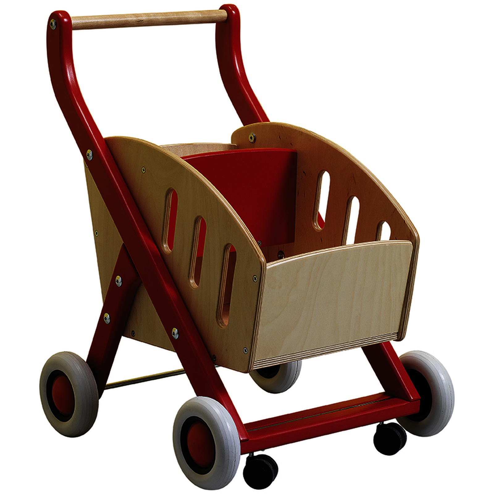 Un Caddie très solide pour faire ses courses et promener bébé.Pour faire ses courses et promener bébé (poupons jusqu'à env. 50 cm), un Caddie très solide qui ne bascule pas et supporte le poids des enfants.• En bois massif et contreplaqué 12 à 22 mm, axes métal, verni incolore et laqué rouge.