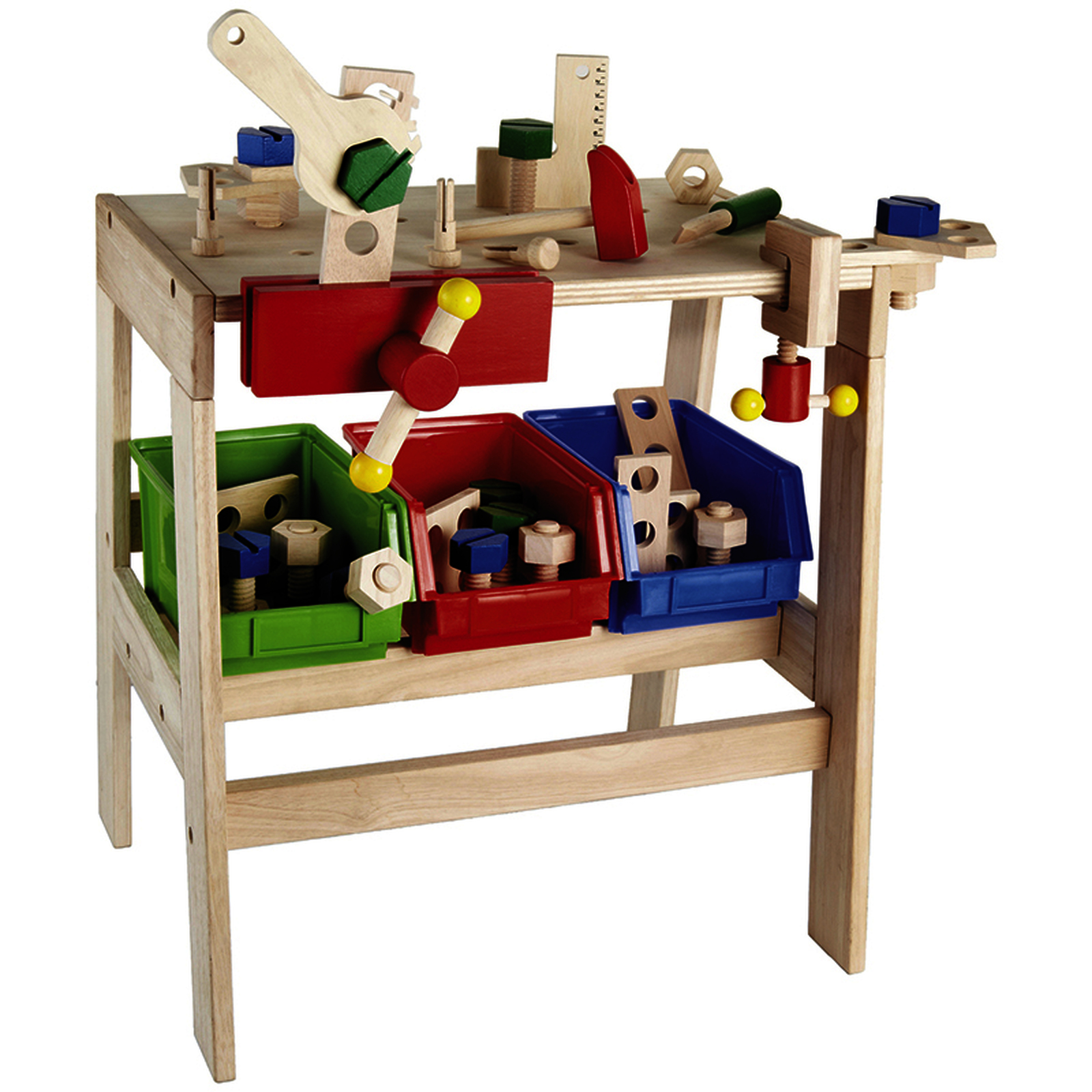 Un établi avec de nombreux outils. En bois, très robuste et stable, il comprend 3 bacs de 3 couleurs en plastique pour ranger les 44 accessoires.Un établi avec de nombreux outils : 1 serre-joint, 1 étau, 1 clé, 1 marteau, 1 tournevis, 1 équerre, des vis, des cales, des lattes de 5 formes ou de tailles différentes. En bois, très robuste et stable, il comprend 3 bacs de 3 couleurs en plastique pour ranger les 44 accessoires.• En bois naturel verni.