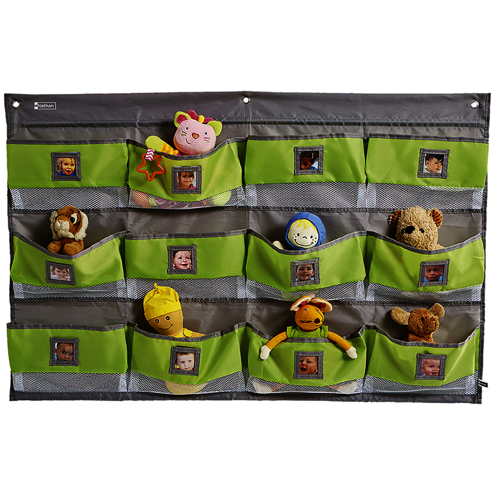 12 pochettes en tissu et filet pour permettre de mieux visualiser le contenu (cahiers, chaussons, doudous ou marionnettes…). Ces 12 pochettes sont personnalisables avec fenêtre d'identification pour faciliter l’organisation du rangement de doudous, petites affaires des enfants ou petit matériel…