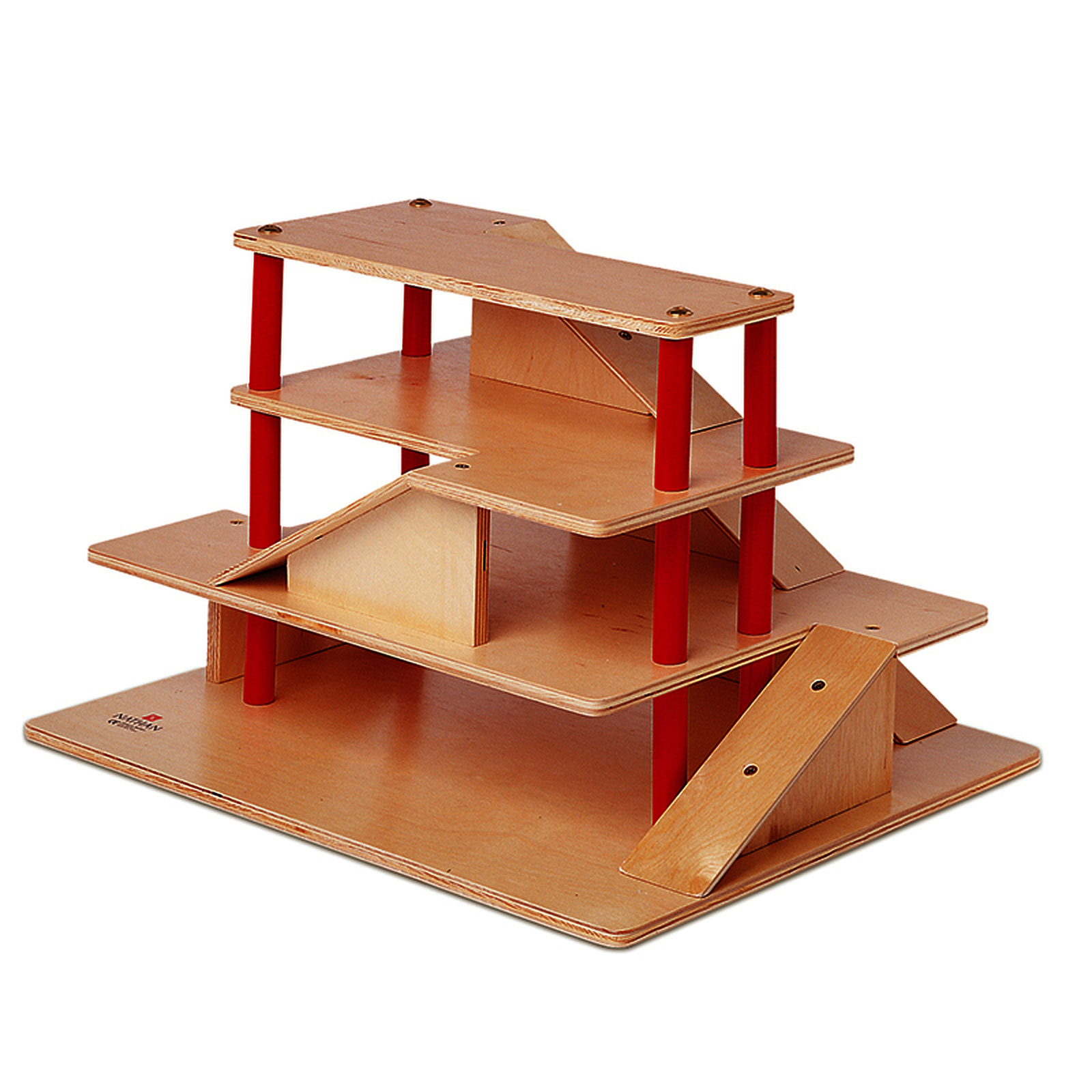 1 garage avec 6 rampes pour relier les niveaux supérieurs et permettre la circulation. En contreplaqué verni avec des tubes teintés en rouge qui soutiennent les plateformes.1 garage avec 6 rampes pour relier les niveaux supérieurs et permettre la circulation. En contreplaqué verni avec des tubes teintés en rouge qui soutiennent les plateformes. Voitures vendues séparément.• En bois contreplaqué verni incolore et laqué rouge.