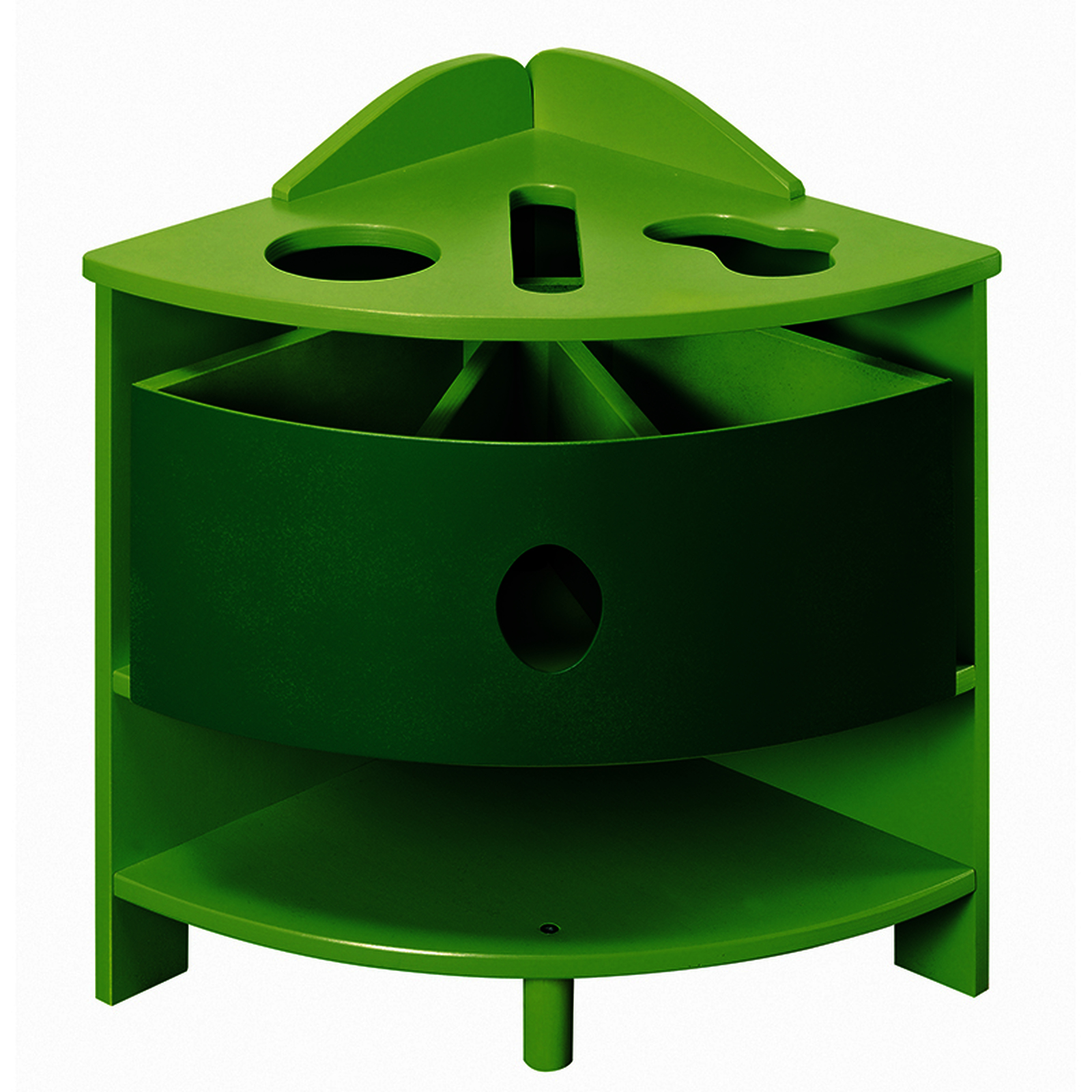 Pour ranger et trier selon la forme des objets : le dessus est percé de 3 trous (rond, rectangle et forme non géométrique), 1 bac en bois à 3 compartiments équipé d'un système antichute, 1 étagère basse.• 7 modules à installer en ligne ou en pôle grâce aux 2 formes : carré et quart de cercle.