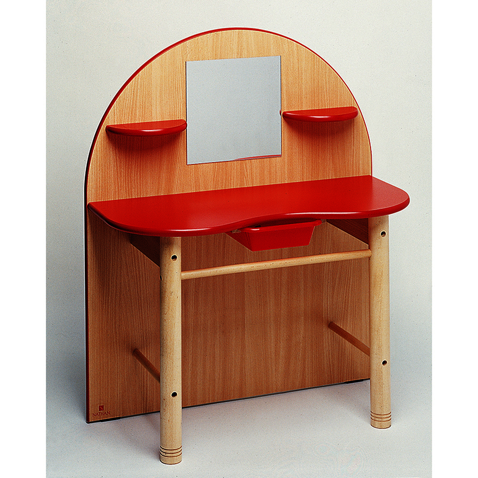 Coiffeuse avec 2 étagères de part et d'autre du miroir et 1 tiroir en plastique.Coiffeuse avec 2 étagères de part et d'autre du miroir et 1 tiroir en plastique pour ranger les accessoires de coiffure et de maquillage.• En mélaminé couleur hêtre et rouge, piètement en bois massif, livrée sans accessoires.