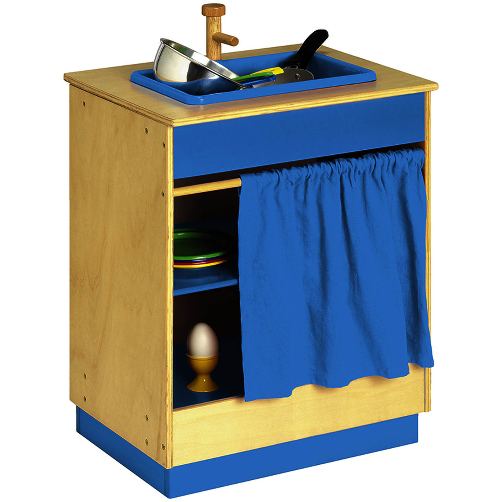 1 évier, 1 robinet en bois et 1 étagère de rangement cachée derrière le rideau. La bassine de l'évier est fixée.• 7 éléments modulaires disponibles en 5 couleurs assorties.