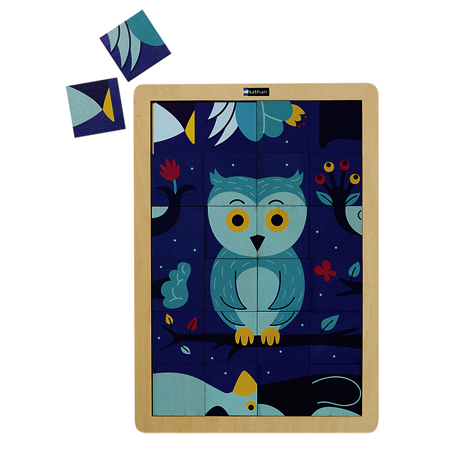 Puzzle magique composé de 24 pièces représentant deux reproductions : Le hibou et le manchot de C. et J. Duhautois."Le hibou et le manchot" de C. et J. Duhautois.