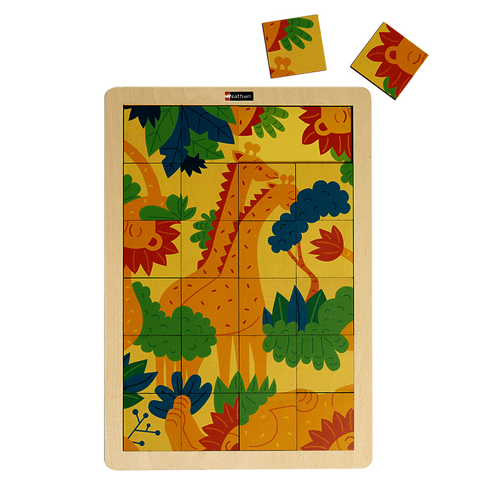 Puzzle magique composé de 24 pièces représentant deux reproductions : Les girafes et le lion de C. et J. Duhautois.