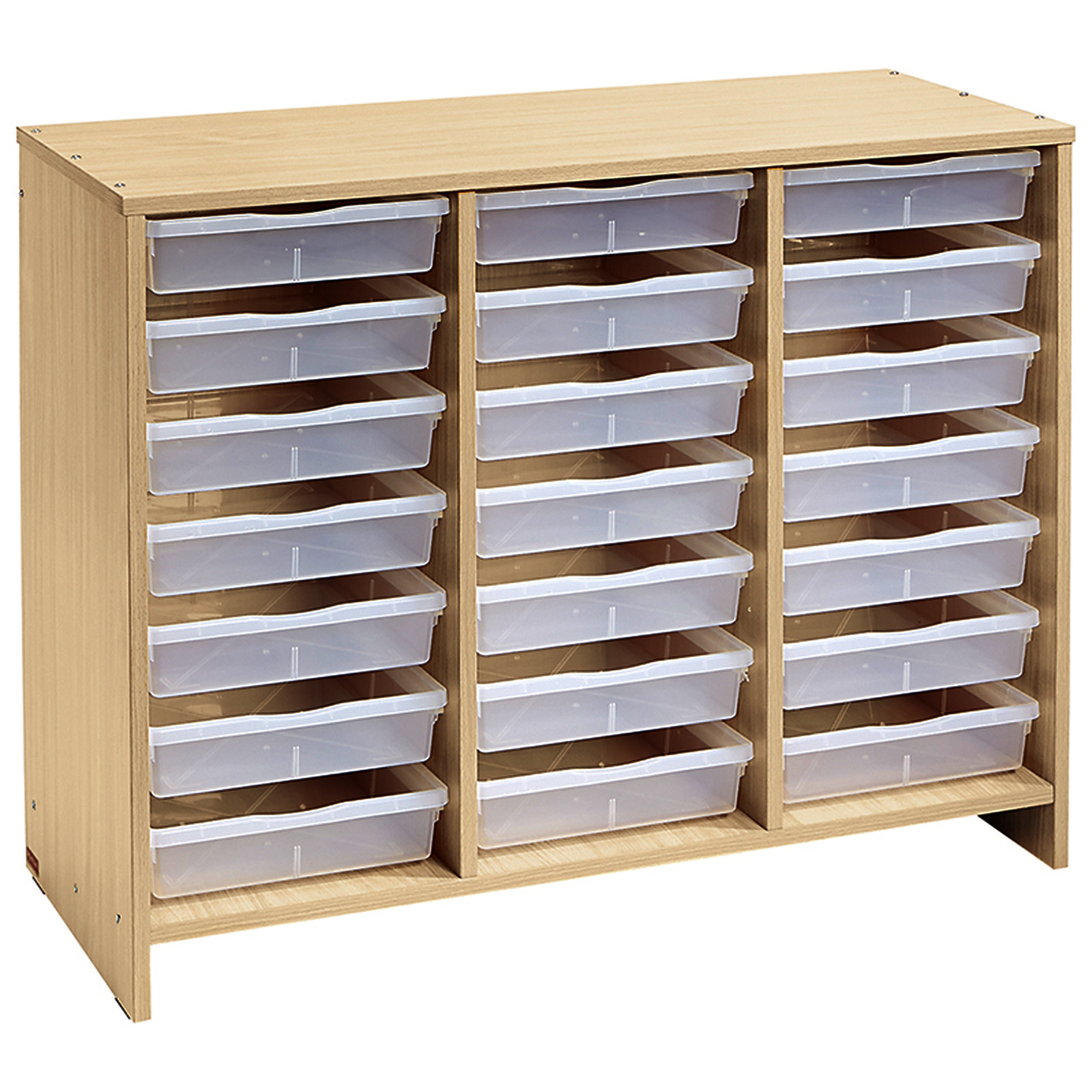 • Meuble bas livré avec 21 bacs plats incolores qui se retirent et se replacent facilement sur les glissières.