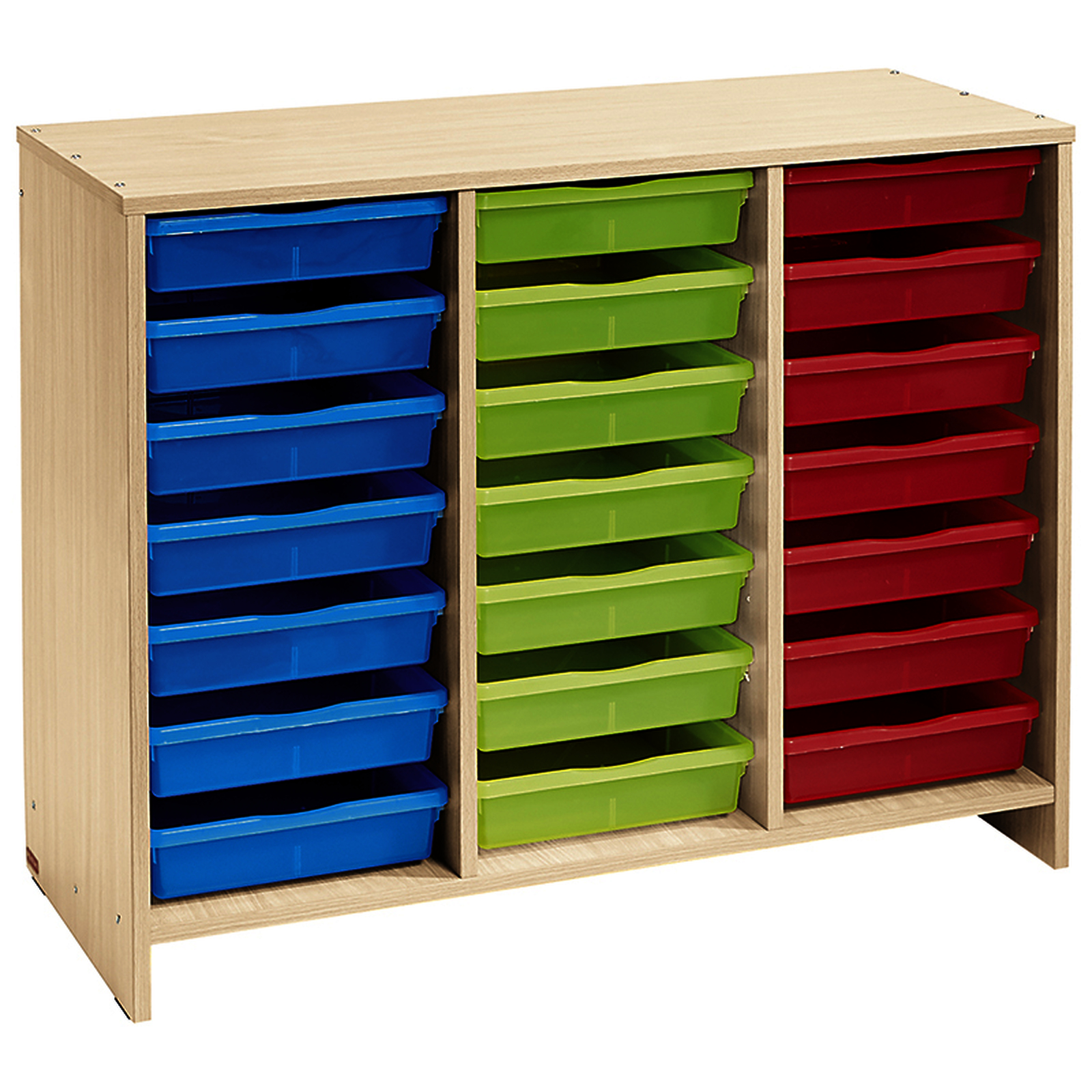 Un meuble bas, teinte bouleau et livré avec 21 bacs plats (7 rouges, 7 verts, 7 bleus), qui peut être utilisé pour :