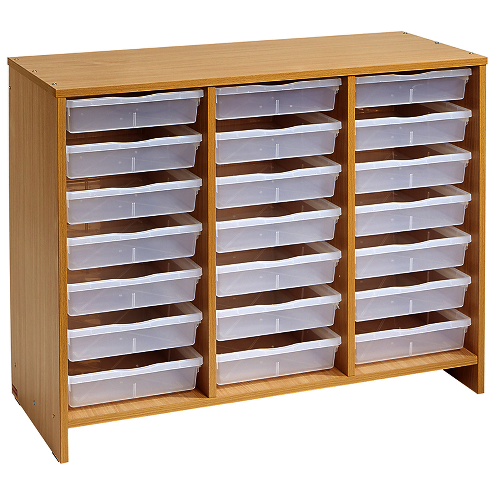 Un meuble bas, teinte hêtre et livré avec 21 bacs, qui peut être utilisé pour :