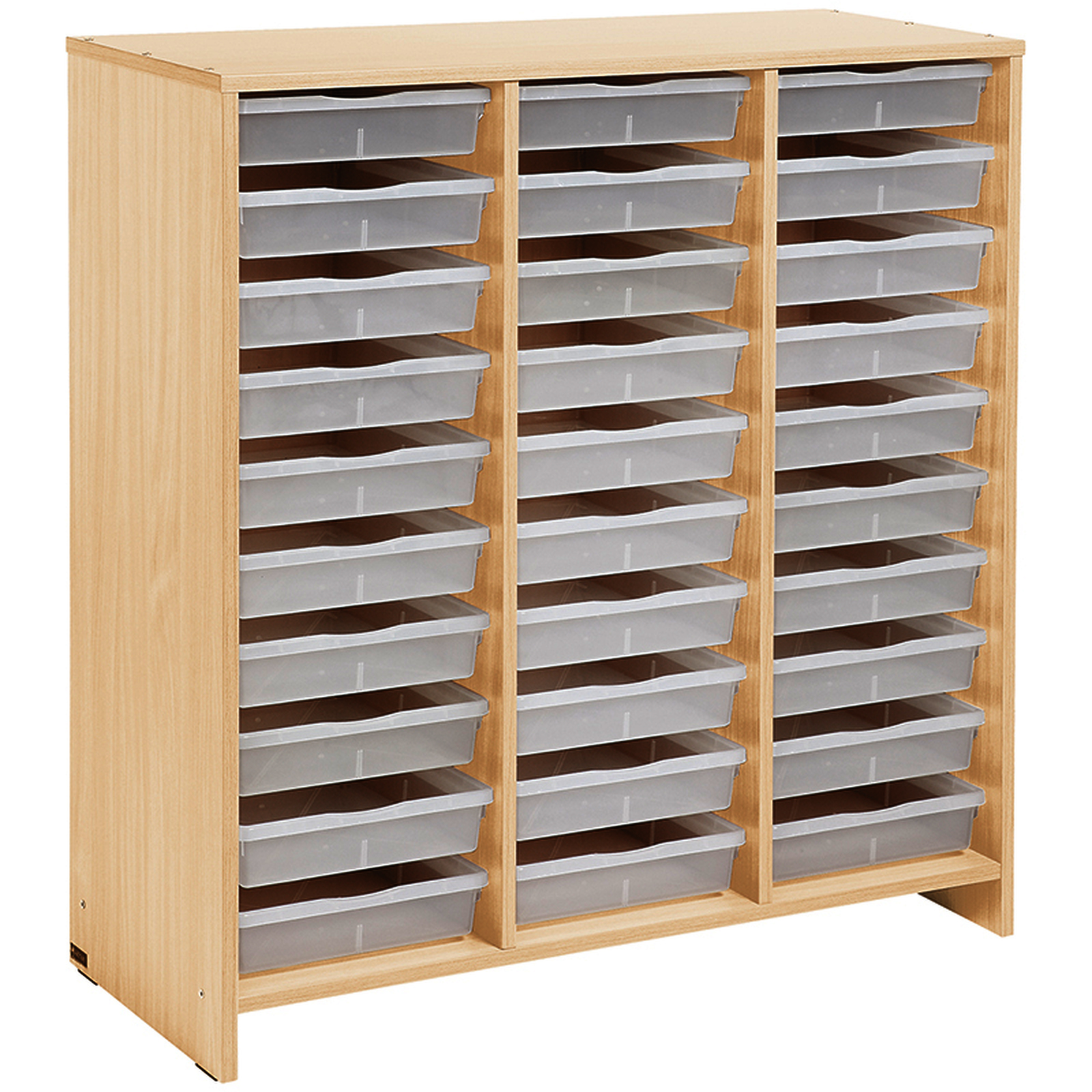 - l'autonomie des enfants.• Un meuble haut livré avec 30 bacs plats incolores qui peuvent se retirer et se replacer facilement sur les glissières.