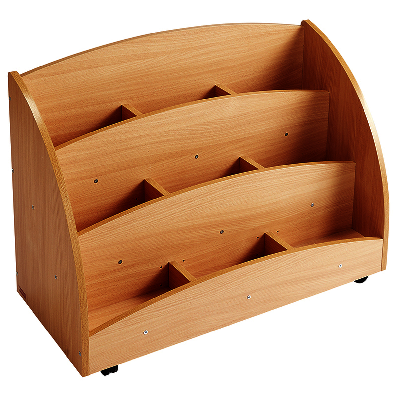 Ce bac à livres présentoir à roulettes (teinte hêtre) comporte 9 compartiments pour présenter et stocker de petites sélections d'ouvrages.Ce bac à livres présentoir monté sur roulettes (teinte hêtre) comporte 9 compartiments pour présenter et stocker de petites sélections d'ouvrages.
