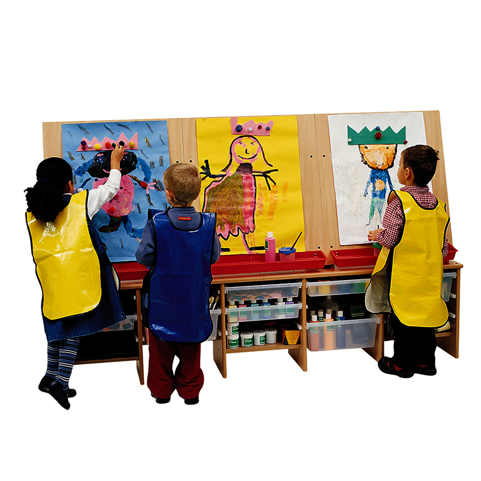 3 étagères en bois et 15 glissières PVC pour recevoir des bacs plastique Nathan (vendus séparément).Meuble à double fonction : peinture et rangement. Livré avec 3 bacs pour chevalet amovibles et 8 pinces pour maintenir le papier.