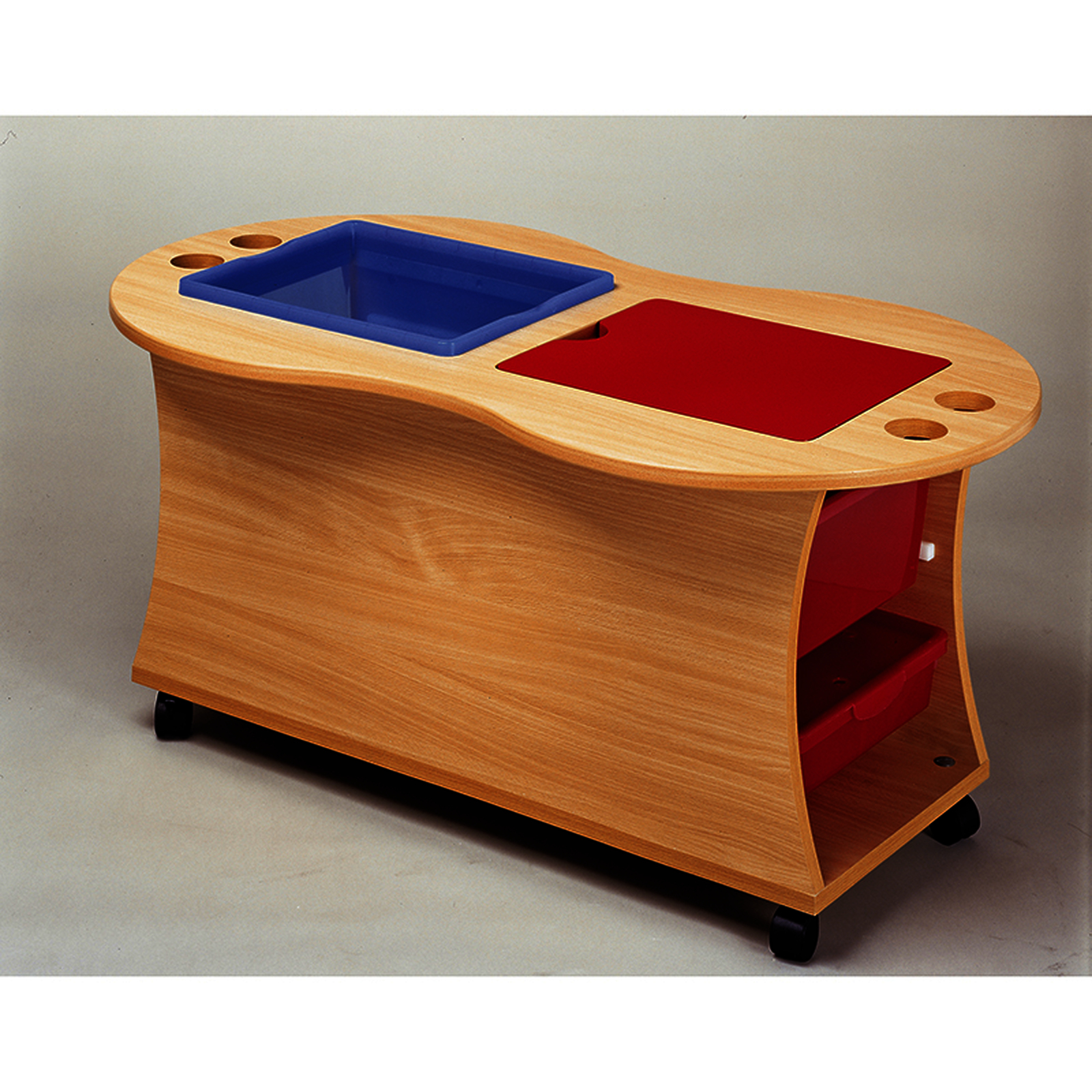 Des plateaux en bois amovibles transforment cette table d'activités en table classique. Elle se déplace grâce à 4 roulettes, dont 2 sont bloquantes. • Livrée avec 4 bacs en plastique transparent : 2 plats (1 rouge, 1 bleu), 2 profonds (1 rouge, 1 bleu) et 2 plateaux en bois.