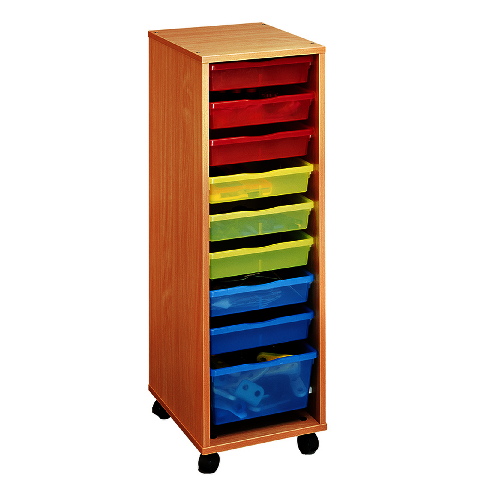 Colonne avec roulettes pour servir de desserte, en appoint, ou pour prolonger un meuble haut. Livrée avec 9 bacs multicolores : 3 plats rouges, 3 plats verts, 2 plats et 1 profond bleu. Contient 10 paires de glissières prémontées en PVC blanc.• Idéal pour ranger le matériel en vrac, les jeux de construction, les fournitures.