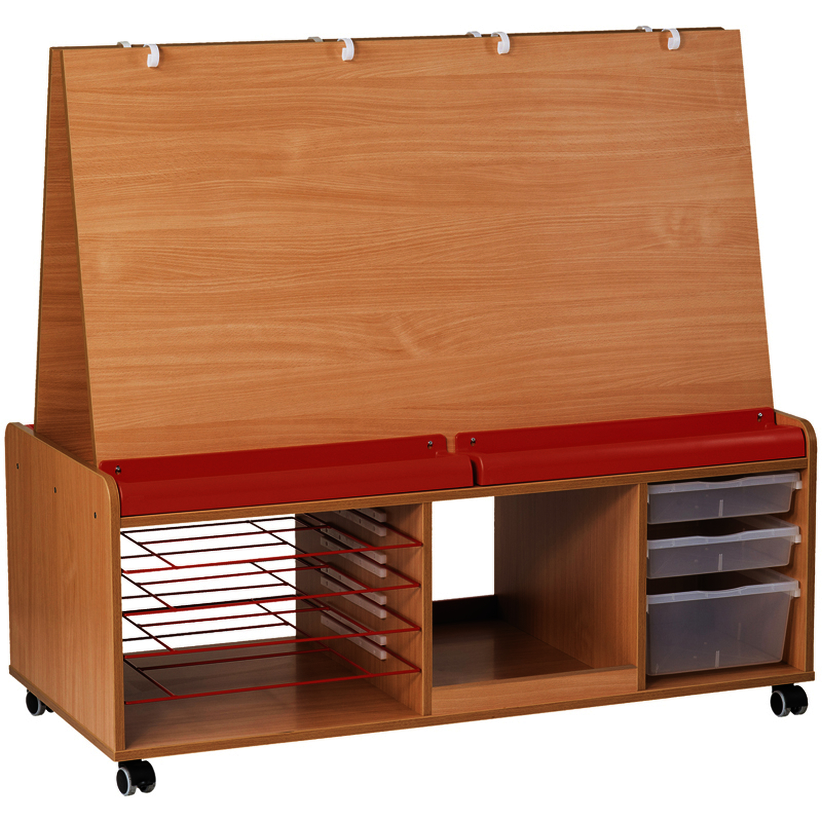 Chevalet sur roulettes pour 4 enfants, avec espaces de stockage et de séchage pour optimiser le rangement dans la classe.Chevalet sur roulettes pour 4 enfants, avec espaces de stockage et de séchage pour optimiser le rangement dans la classe.• L/prof./H : 129 x 60 x 112 cm.
