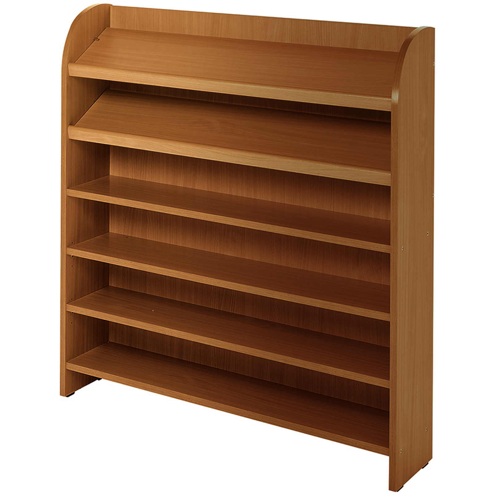 6 étagères dont 2 étagères de présentation des livres et 2 réglables.6 étagères dont 2 pivotantes pour la présentation du matériel, 2 fixes et 2 réglables.• En mélaminé teinte hêtre.