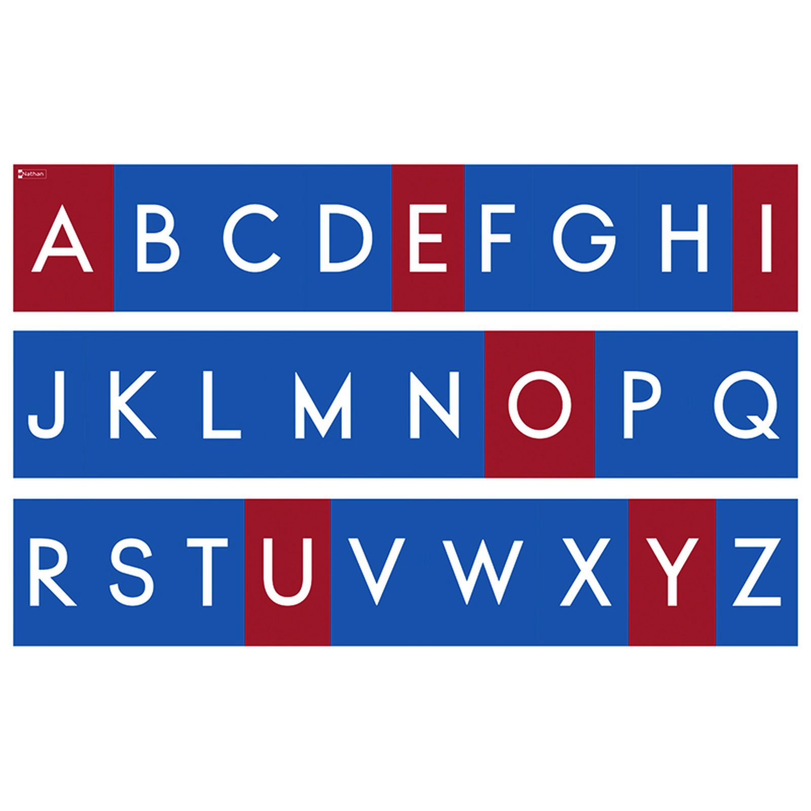 3 grandes bandes murales repositionnables avec des lettres capitales rugueuses à suivre avec son doigt pour s'entraîner au tracé de ces lettres.Bandes de lettres rugueuses à placer sur une surface lisse, pour une première approche des lettres à la verticale tout en développant la sensibilité tactile.