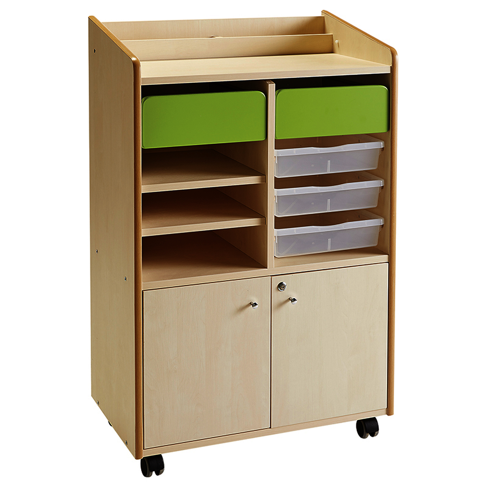 Ce meuble accompagne l'enseignant dans sa pratique de classe flexible.Ce meuble se compose d'un plan de travail inclinable pour une posture ergonomique, de 2 tiroirs et d'un espace permettant de ranger du petit matériel :