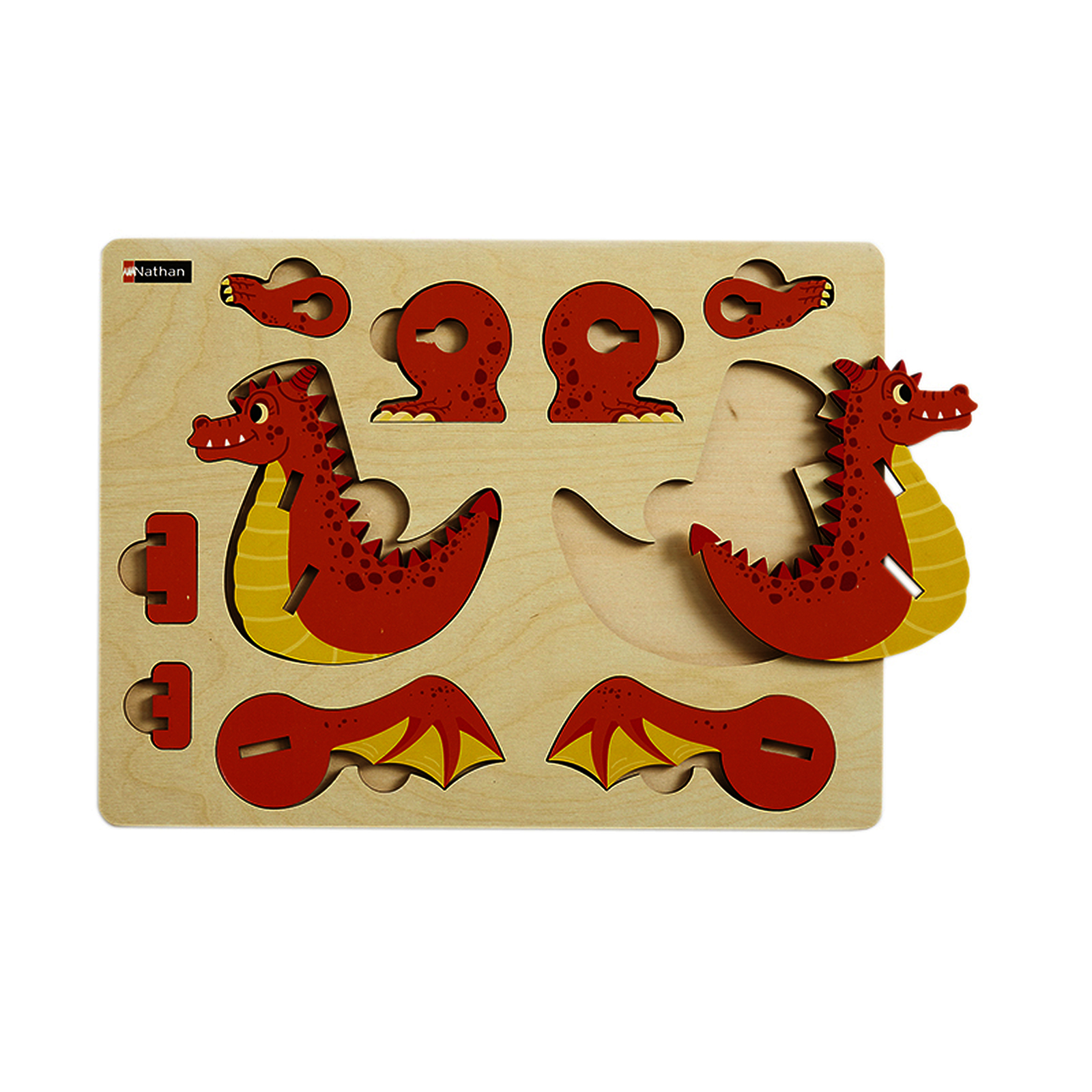 10 pièces en bois à assembler selon le schéma de montage pour construire le dragon.Des éléments en bois découpé et verni, à assembler selon le schéma de montage en quelques étapes, indiqué au dos du plateau.