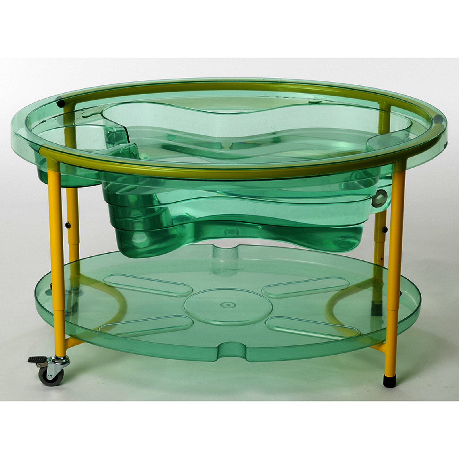 Un bac à eau et à sable transparent pour faciliter les expériences et les observations.Sa transparence facilite expériences et observations. Il est constitué d'un bac en plastique résistant avec rebords et muni d'un robinet de vidange, d'un couvercle qui peut se placer sous le bac pour y déposer les accessoires et de pieds tubulaires réglables en hauteur (de 44 à 58 cm) équipés de roulettes avec frein.• En plastique, piètement métal.