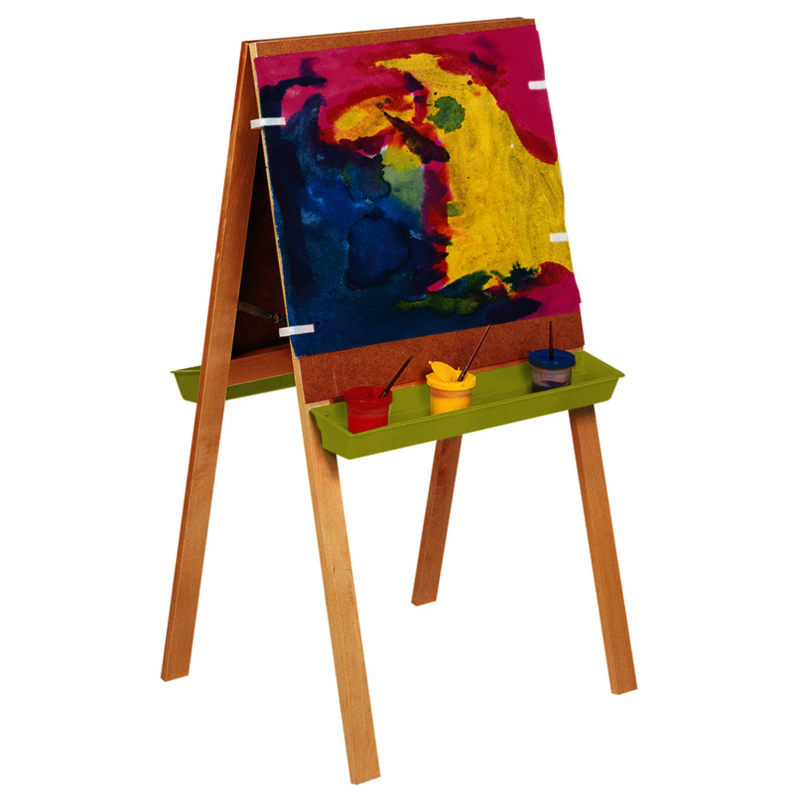 Ce chevalet, prévu pour 2 enfants, se replie après utilisation. Livré avec 2 bacs en plastique verts pour chevalet et 6 pinces pour accrocher le papier.Ce chevalet, prévu pour 2 enfants, se replie après utilisation. Livré avec 2 bacs en plastique verts pour chevalet et 6 pinces pour accrocher le papier.• L/l panneau : 65 x 60 cm ; H chevalet : 120 cm.