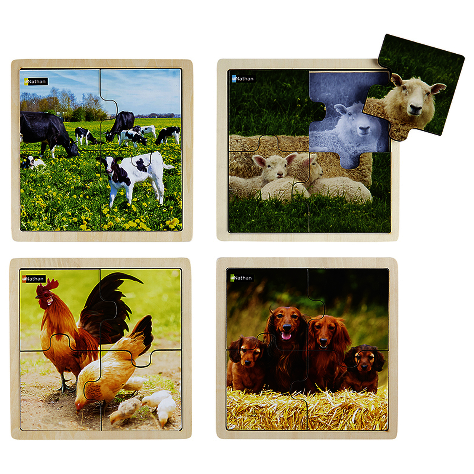 4 puzzles composés de 4 pièces chacun avec des photos réelles d'animaux : coq et poule, chiens, vaches, brebis.• Des animaux à reconstituer avec modèle (amovible).