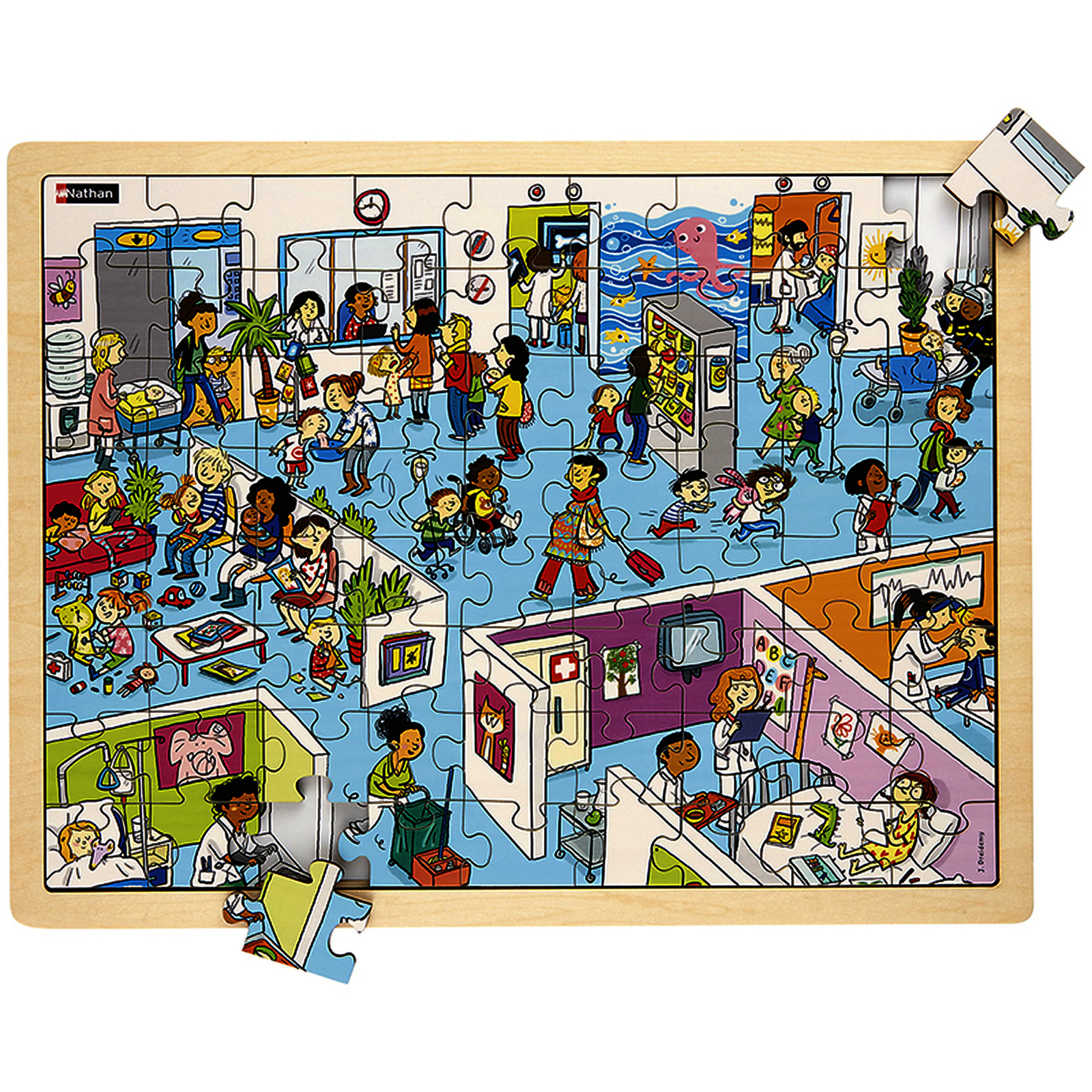 Un puzzle grand format de 72 pièces en bois sur le thème de l'hôpital.La scène comporte de nombreux détails favorisant les situations de langage et d'observation.• 72 pièces et 1 socle en bois verni