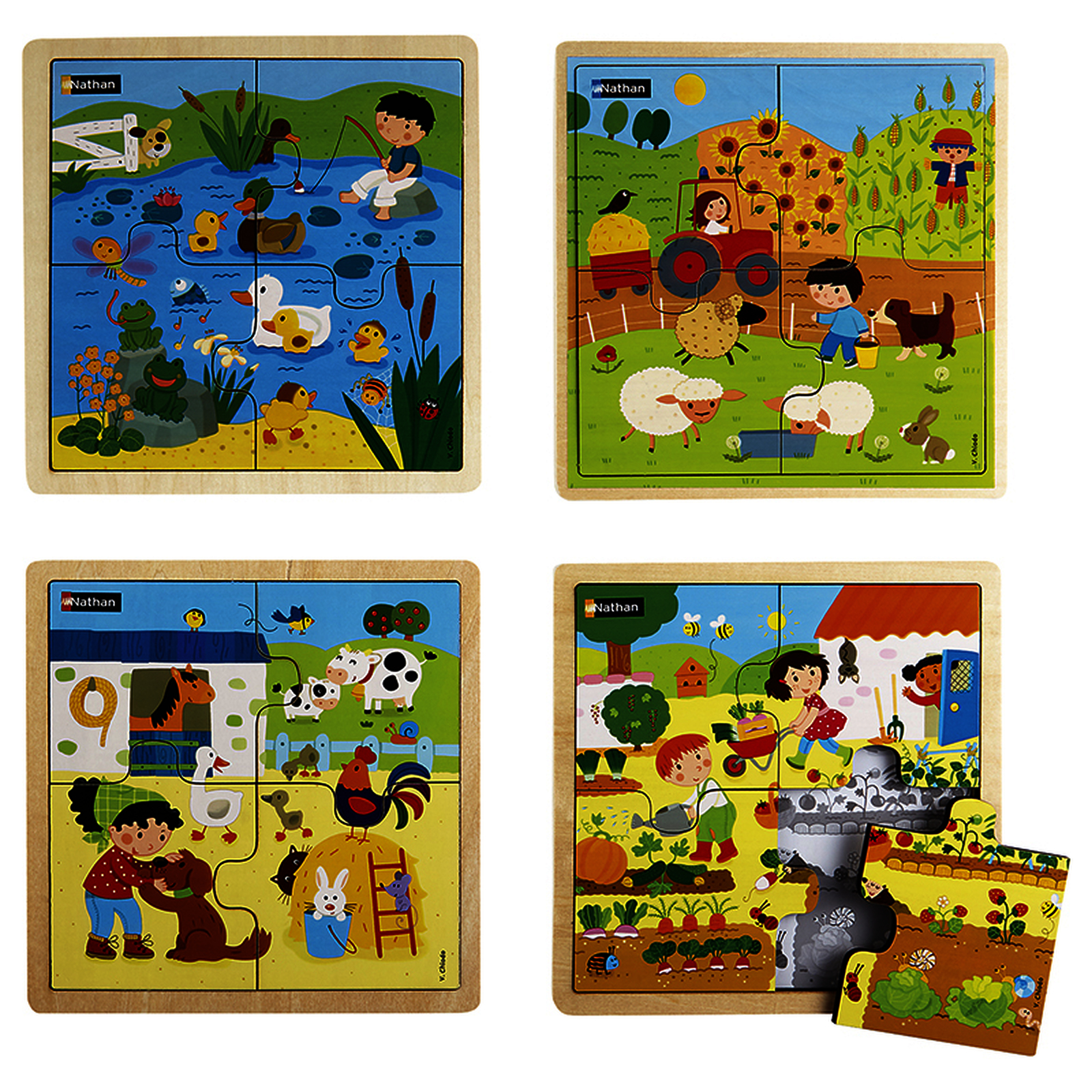 4 puzzles composés de 4 pièces sur le thème de la cour de ferme, la mare aux canards, le potager et les champs.• Des puzzles sur le thème de la campagne à reconstituer avec ou sans le modèle.