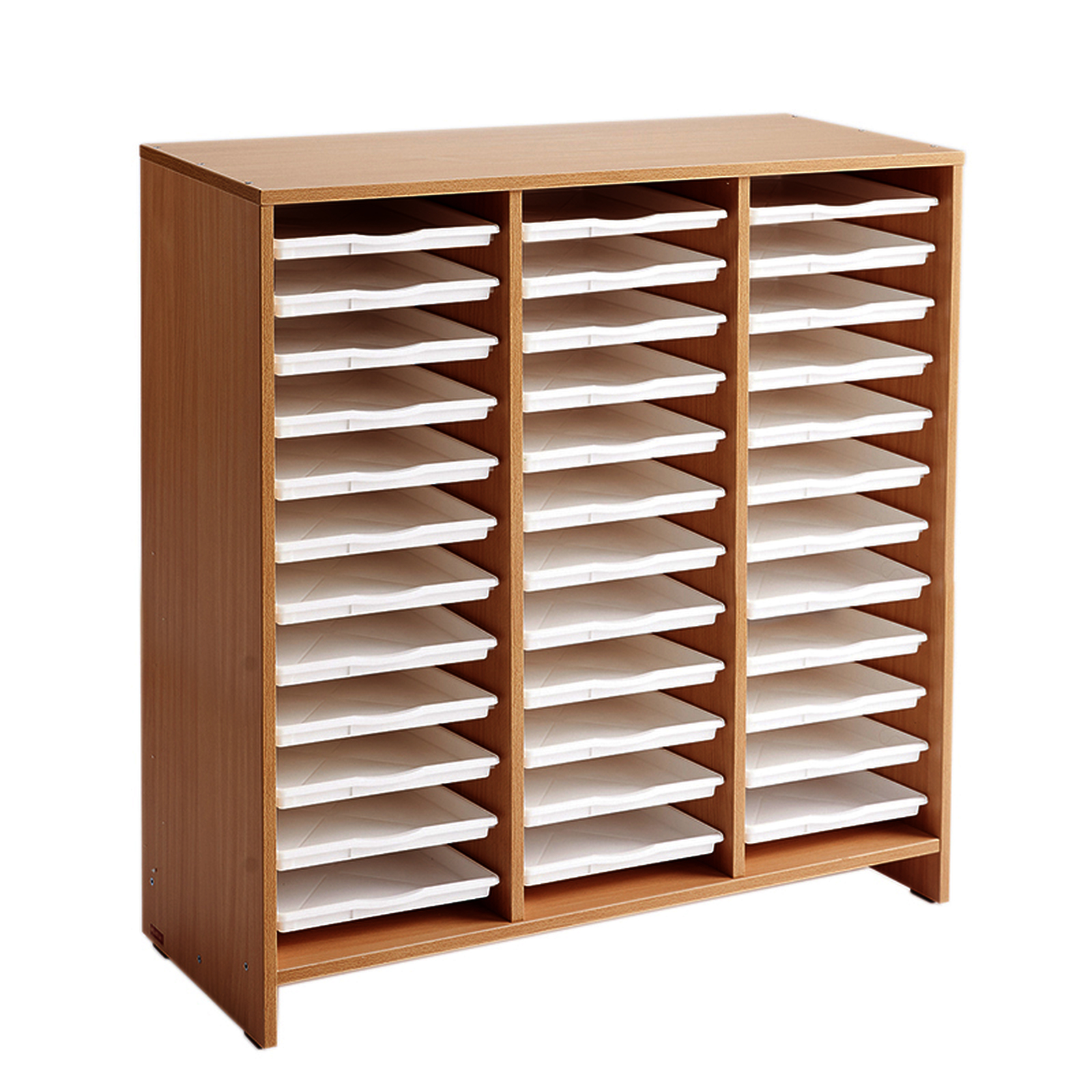 Un meuble teinté hêtre livré avec 36 plateaux blancs amovibles.Un meuble teinté hêtre livré avec 36 plateaux blancs amovibles.• L/l/H : 100 x 41,5 x 106 cm.