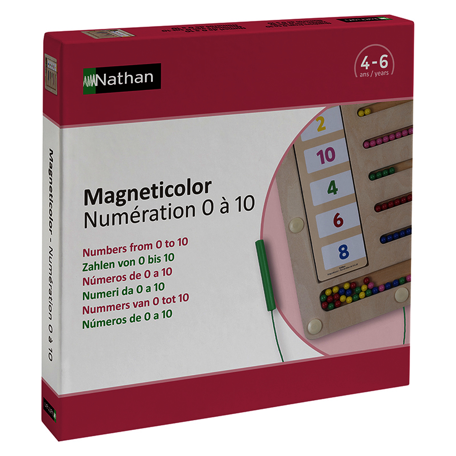 Magneticolor - Numération 0 à 10 est un jeu de parcours magnétique. Il propose des activités de motricité fine, de concentration et de décodage-codage sur les nombres de 0 à 10.À l’aide du stylet aimanté, l’enfant place une à une les billes magnétiques sur la bonne ligne afin de répondre à la consigne de la fiche. Attention, chaque quantité est associée à une couleur et les billes ne doivent pas se mélanger ! Les 12 fiches, recto verso, proposent 24 activités organisées en 6 séries. - Séries 1 à 4 : Les quantités sont représentées par les doigts de la main, les boites à nombres, les constellations du dé, l’écriture chiffrée. - Série 5 : Les quantités sont représentées par l’écriture chiffrée et une couleur. - Série 6 : Les quantités sont sous toutes les représentations. COMPÉTENCES DÉVELOPPÉES • Identifier et nommer 5 couleurs. • Exercer la motricité fine et la coordination œil-main. • Se repérer dans l’espace. • Dénombrer des quantités de 0 à 10. • Associer des collections à différentes représentations du nombre. • Savoir lire et décoder une fiche.La boîte contient : • 1 livret pédagogique. • 12 fiches recto verso, soit 24 activités (21 x 6 cm). • 1 Plateau en bois verni recouvert d’une plaque en plastique (L/l/ép. : 25,4 x 24,2 x 1,6 cm). • 50 billes métalliques de 5 couleurs.