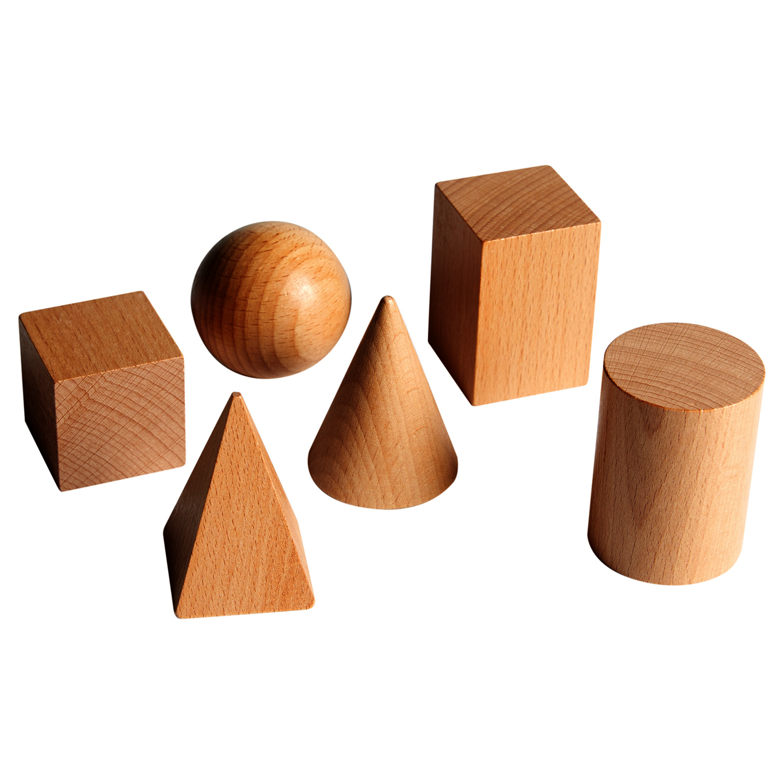 2 cubes, 2 pavés et 2 pyramides.• Lot de 12 solides en bois verni.