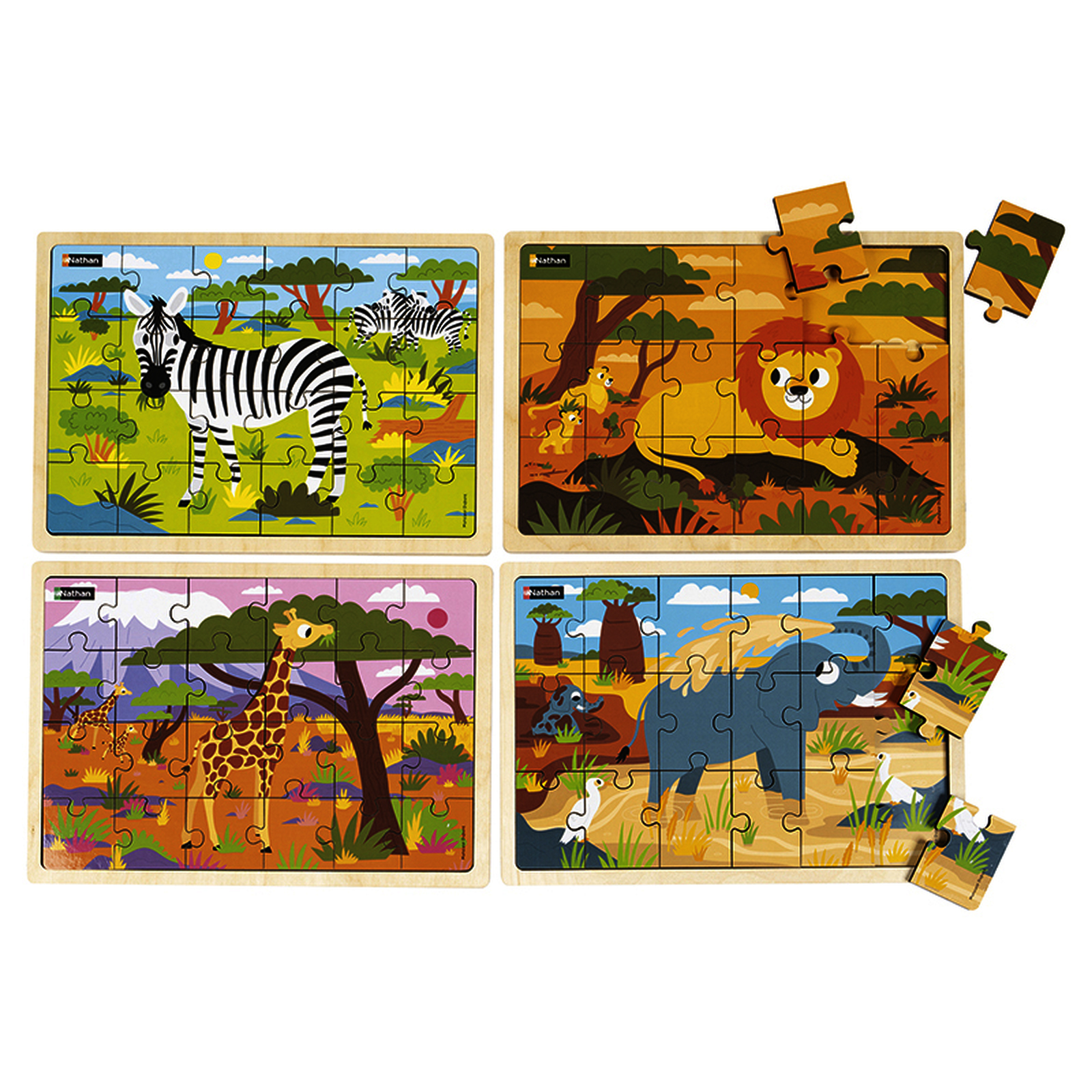4 puzzles de 18 et de 24 pièces sur le thème des animaux de la savane : le zèbre, le lion, la girafe et l'éléphant.